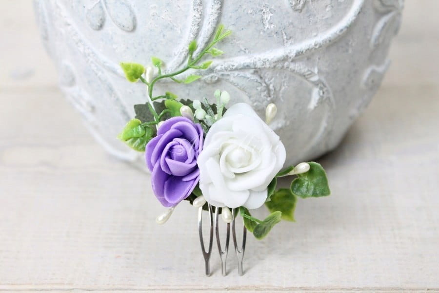 Wykonany z biało fioletowych kwiatów róży, zdobiony, listkami bluszczu który swoim kształtem przypomina serduszka, perłowymi pręcikami perełek oraz dekoracyjną trawką.