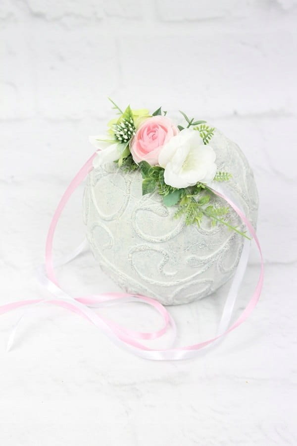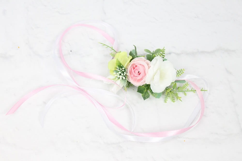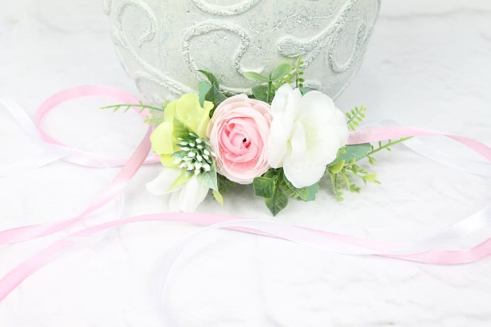 Wiązany za pomocą tasiemek w kolorach dopasowanych do kwiatów, pasuje zatem zawsze idealnie.