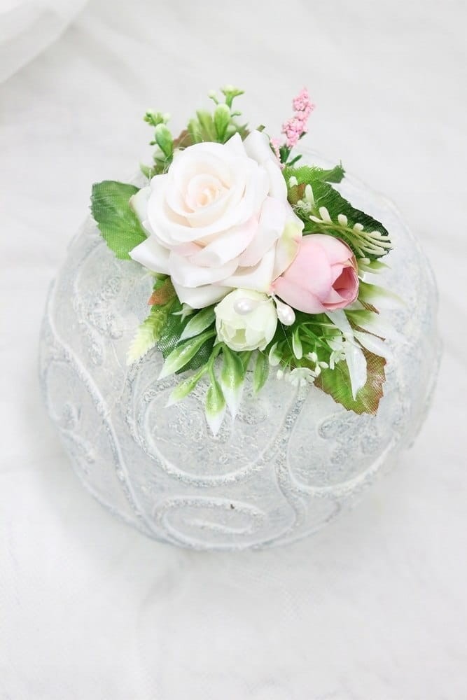Zdobiony listkami róży, paproci oraz perełkami.