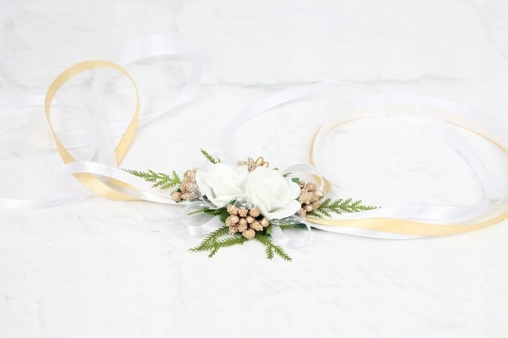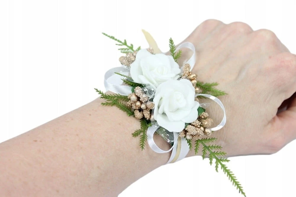 Subtelny i uroczy bukiecik na rękę, wykonany z białych kwiatów róży, zdobiony pęczkami perełek, gałązkami paproci oraz wstążkami.