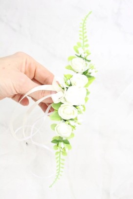 Wykonana z pięknych różyczek w cudownych odcinaniach, ozdobiona perłowymi perełkami, dekoracyjnymi listkami bluszczu oraz traw idealnie wpisującymi się w obecne trendy.