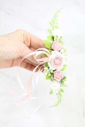 Wykonana z pięknych różyczek w cudownych odcinaniach, ozdobiona perłowymi perełkami, dekoracyjnymi listkami bluszczu oraz traw idealnie wpisującymi się w obecne trendy.