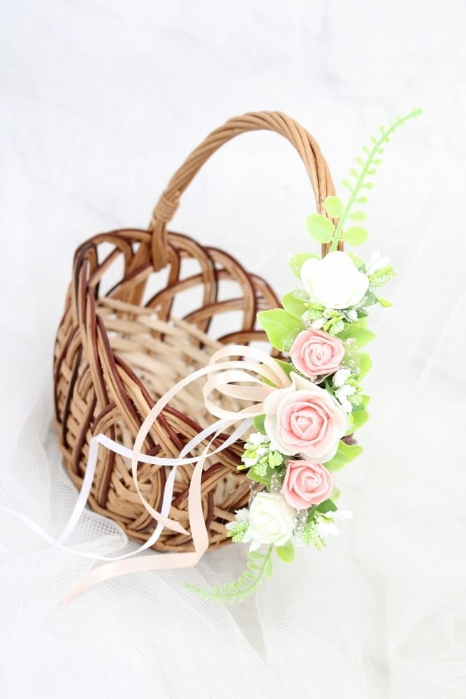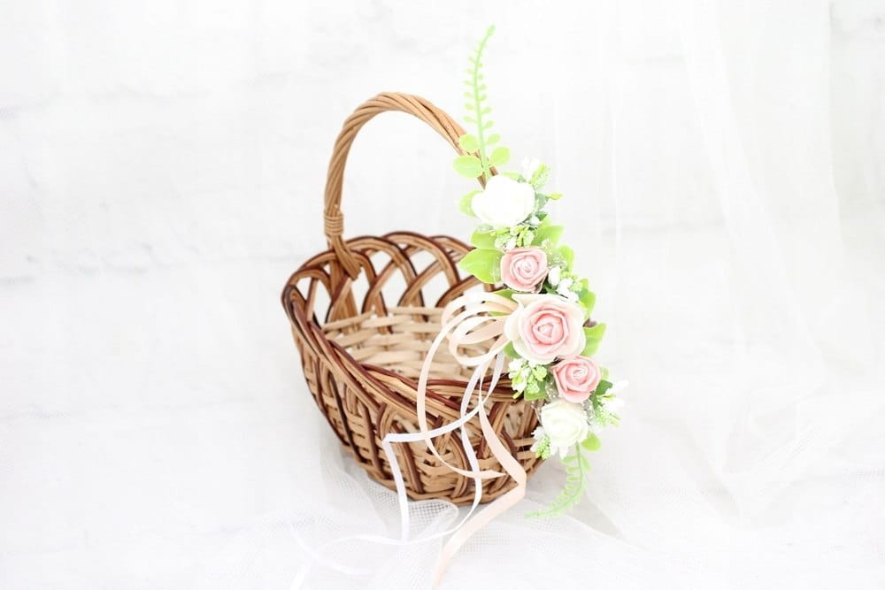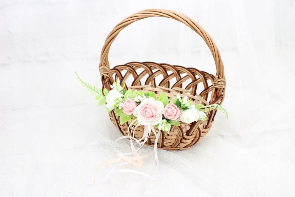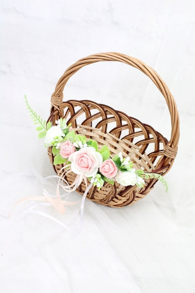 Zamocowanie dekoracji na koszyku jest niezwykle proste i intuicyjne, cieńszą i krótszą tasiemkę należny zawiązać obok uchwytu lub z przodu koszyczka.