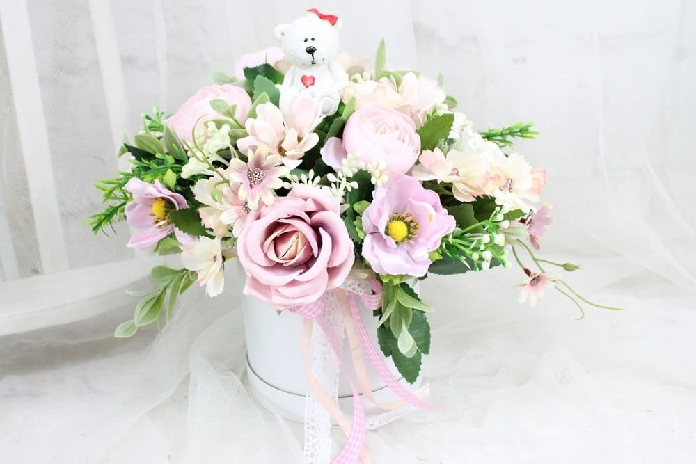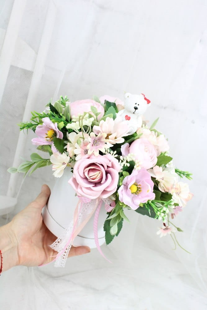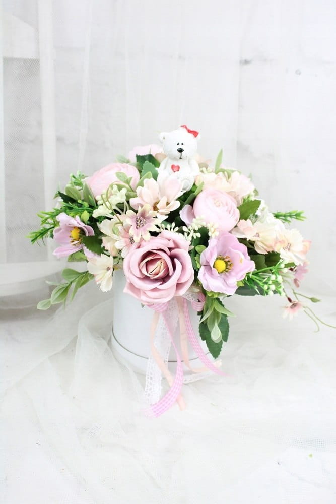 Flower Box z Misiem RÓŻOWY kompozycja kwiaty roczek chrzest baby shower
