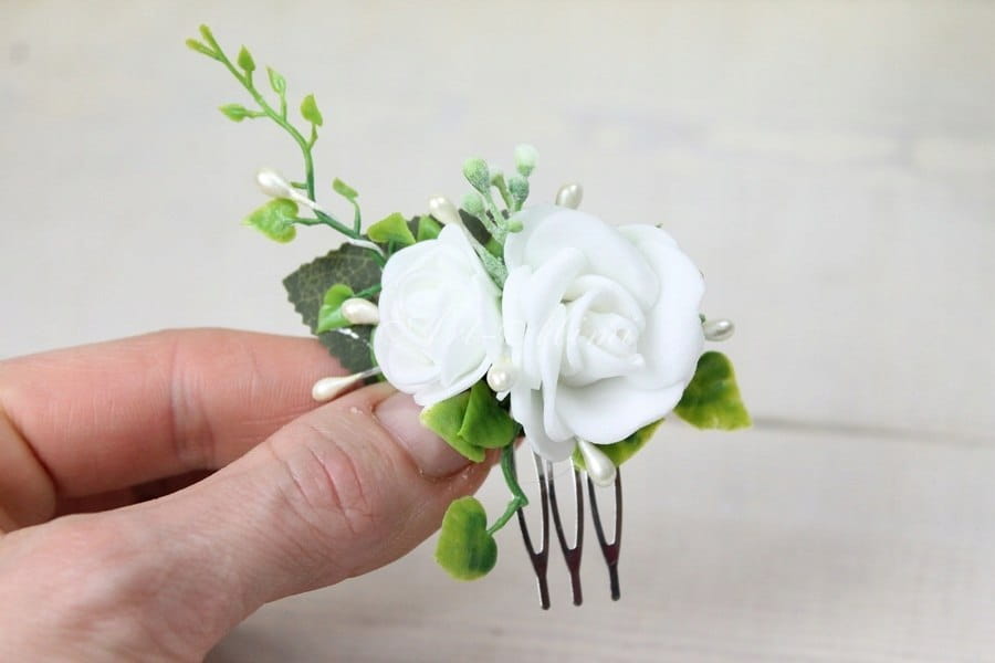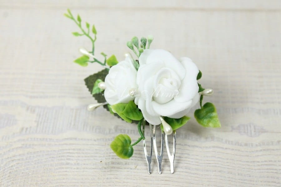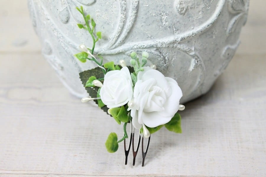Uroczy mały grzebyk, wykonany z śnieżno białych różyczek.