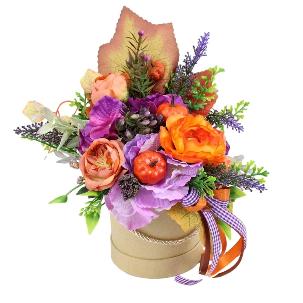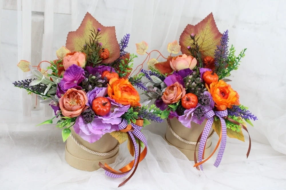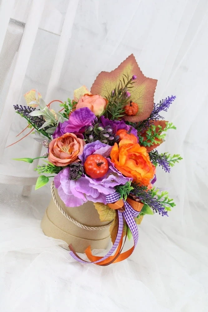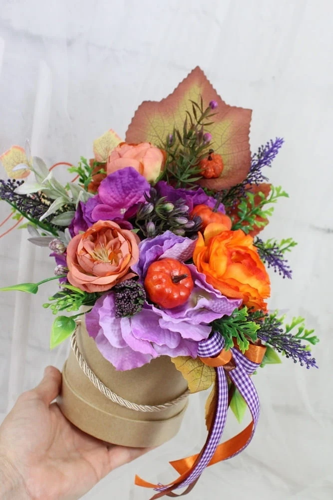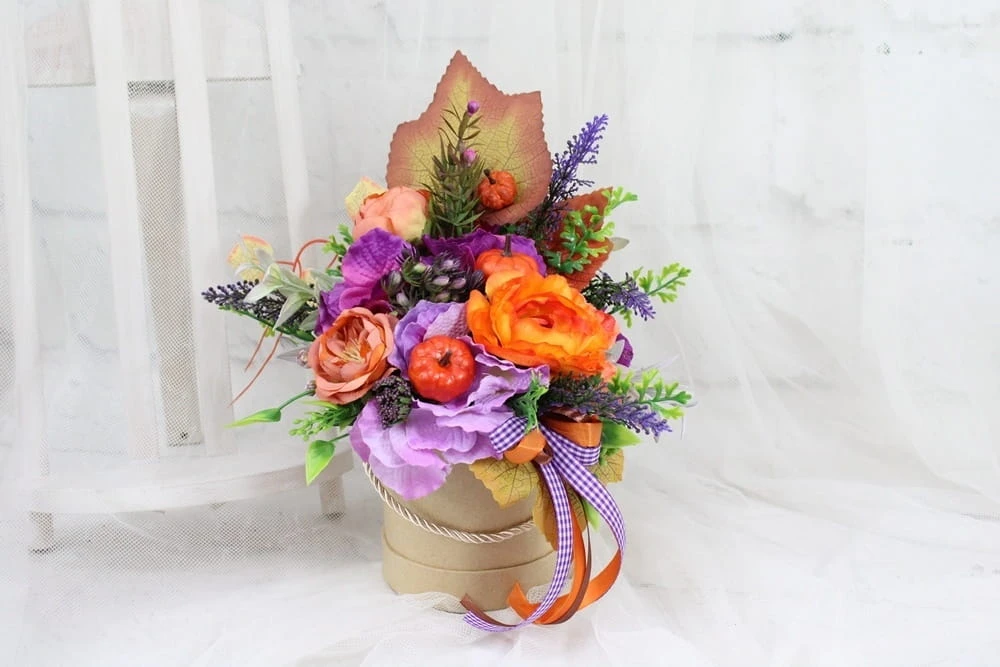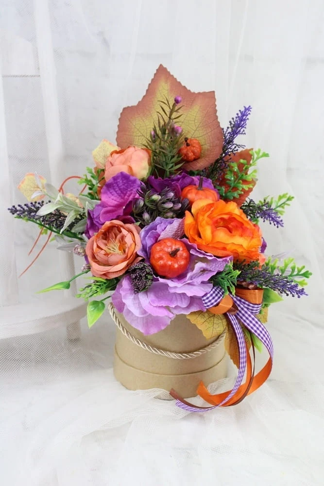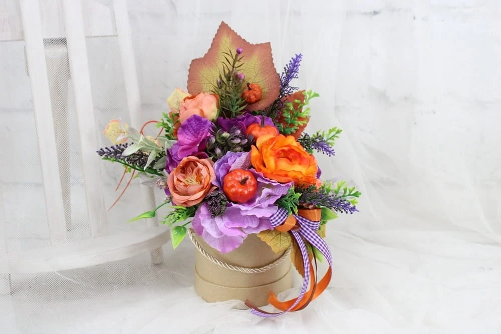 Udekorowana naturalnie wyglądającymi sztucznymi jesiennymi kwiatami, dekoracyjnymi gałązkami oraz pięknymi dodatkami, idealnie wpisująca się w obecne trendy.