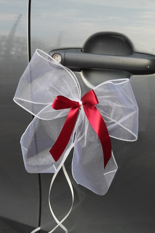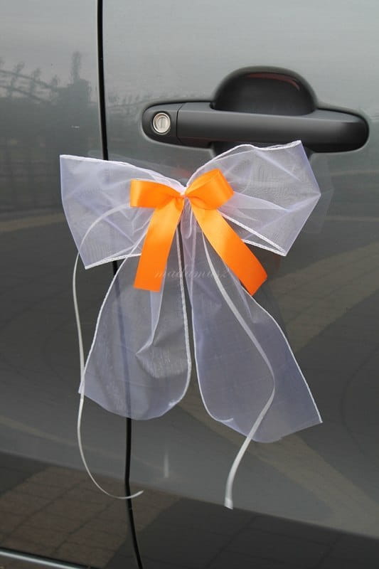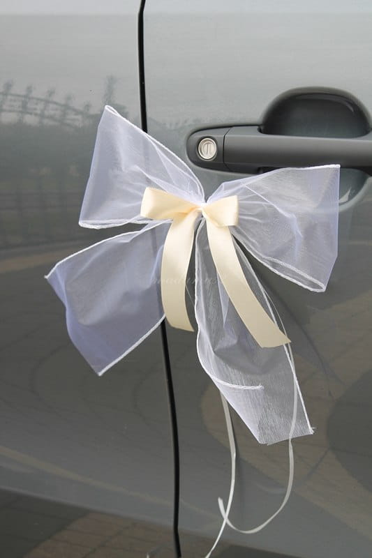 Kokardy zostały wykonane z białego szyfonu przyozdobionego satynową tasiemką w wybranym kolorze.