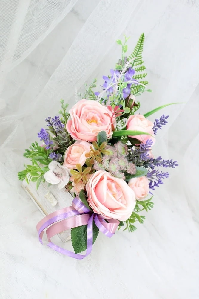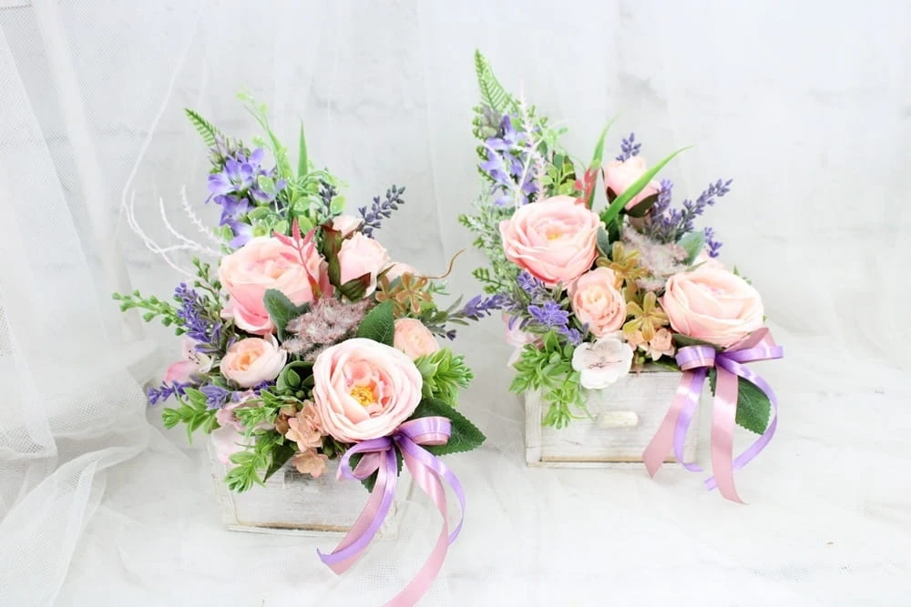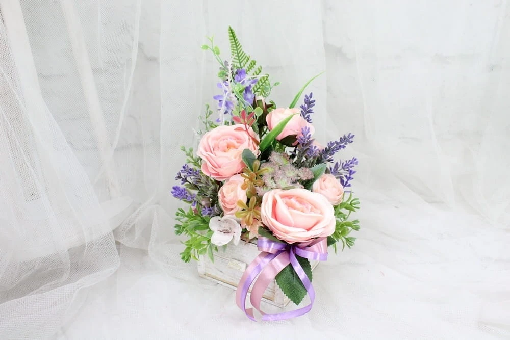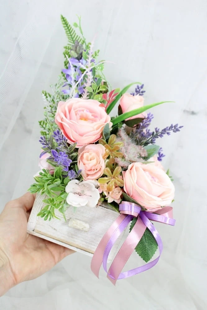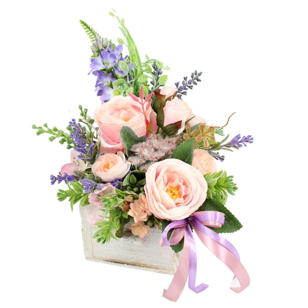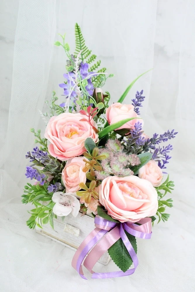 Udekorowana naturalnie wyglądającymi sztucznymi kwiatami w tonacji fioletu i różu, dekoracyjnymi gałązkami oraz pięknymi dodatkami, idealnie wpisującymi się w obecne trendy.