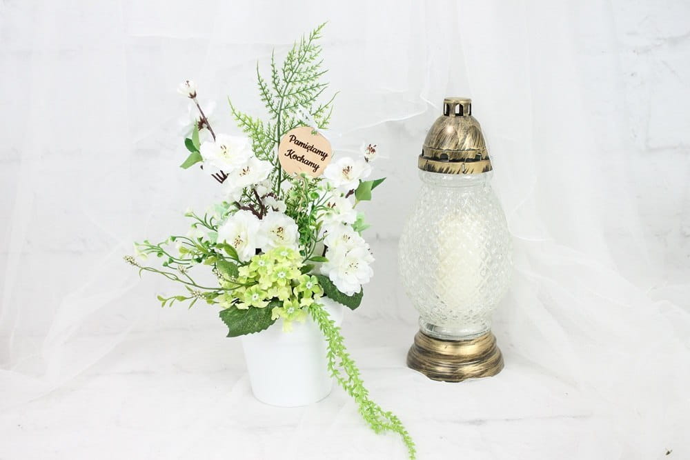 Niezwykle pięknie będzie się prezentowała na grobie lub w kolumbarium. Kompozycja jest lekko obciążona, jest zatem stabilna.