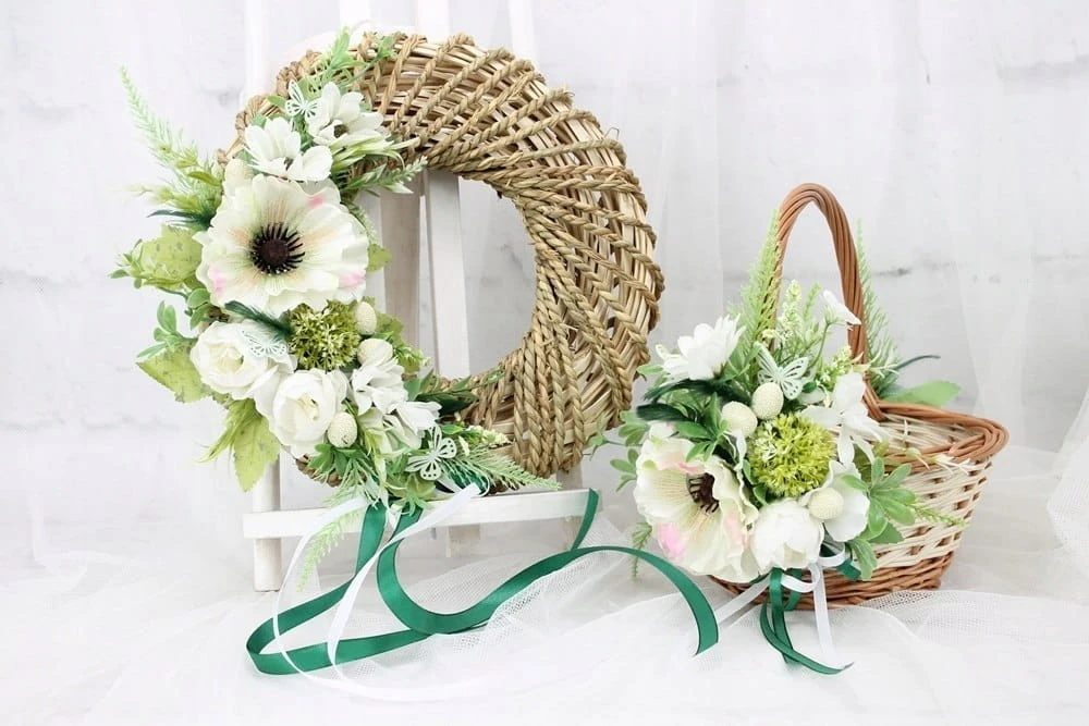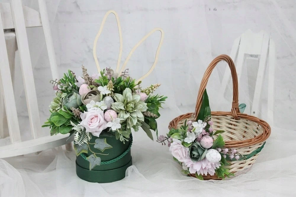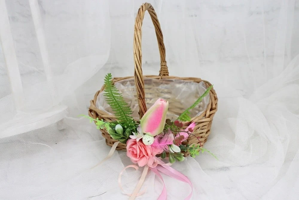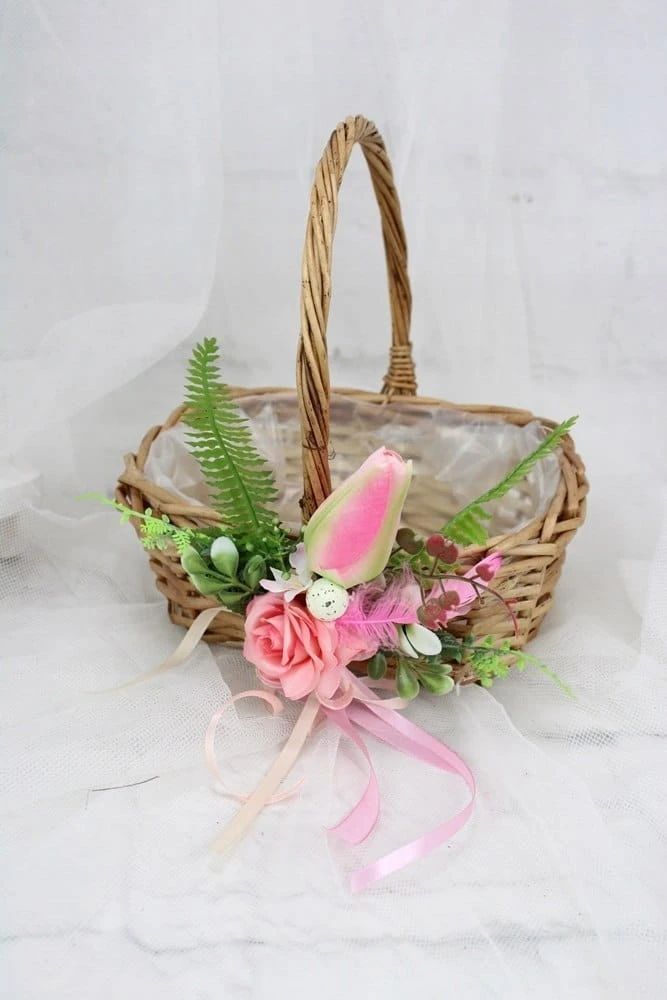 Koszyk wykonany jest z naturalnej wikliny, udekorowany kwiatami i pąkami wiosennych kwiatów. Zdobiony jajkami, dekoracyjnymi listkami bluszczu oraz traw idealnie wpisującymi się w obecne trendy.