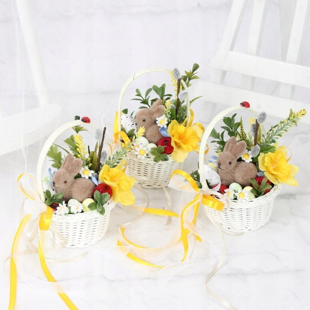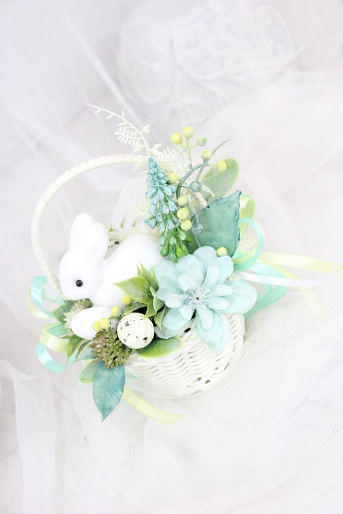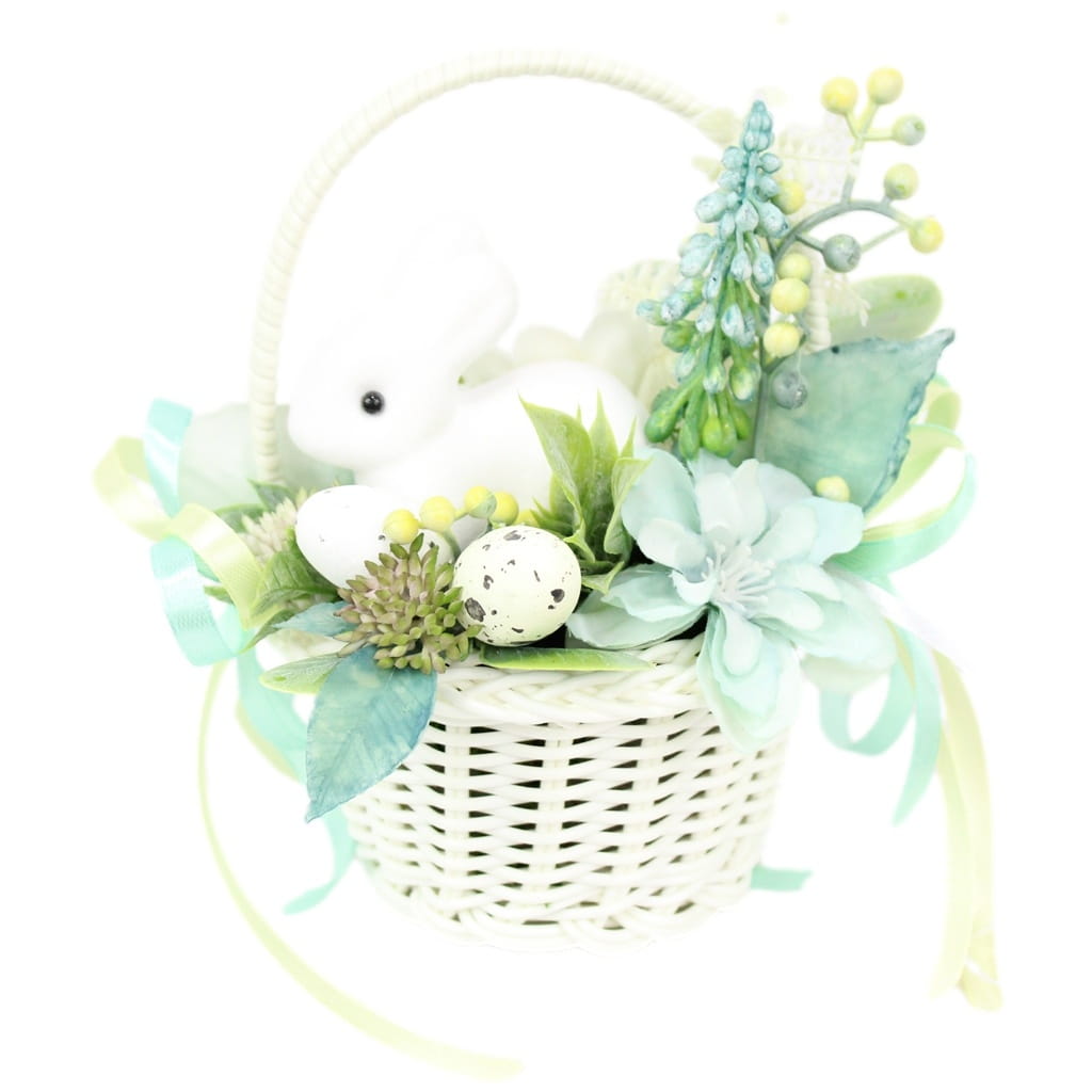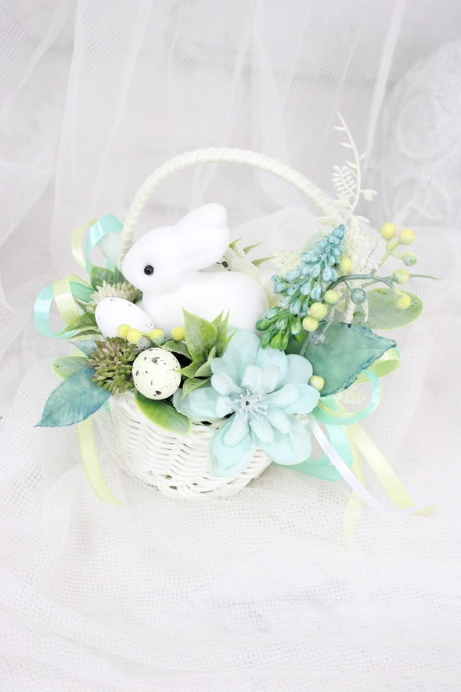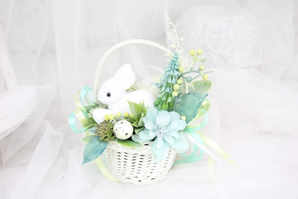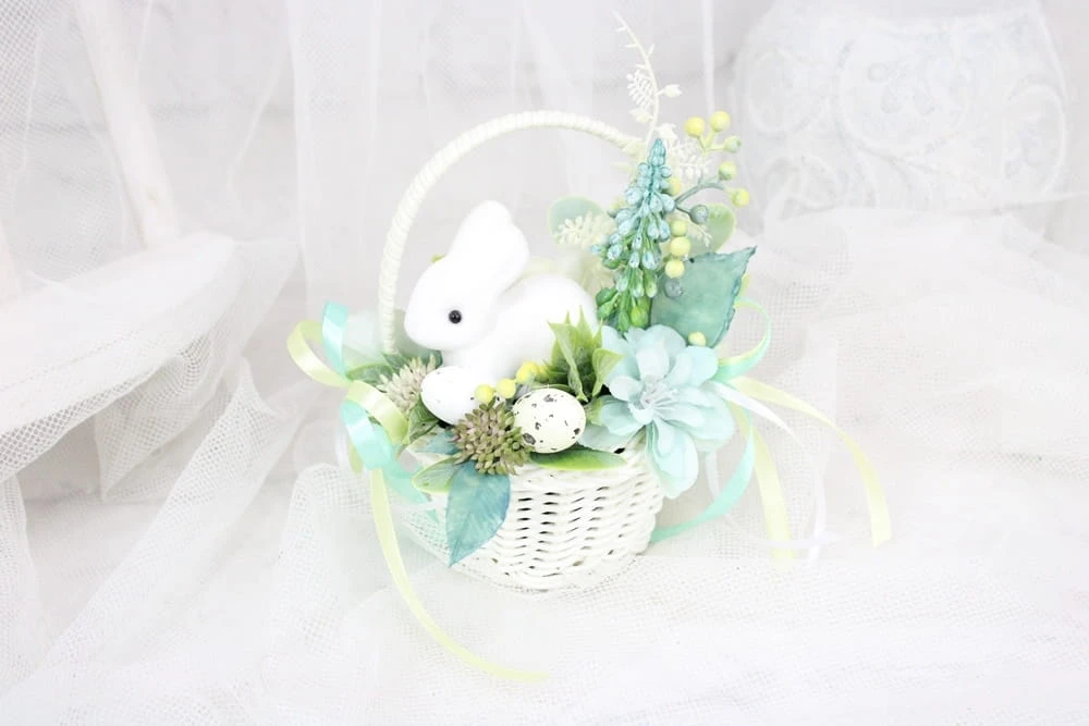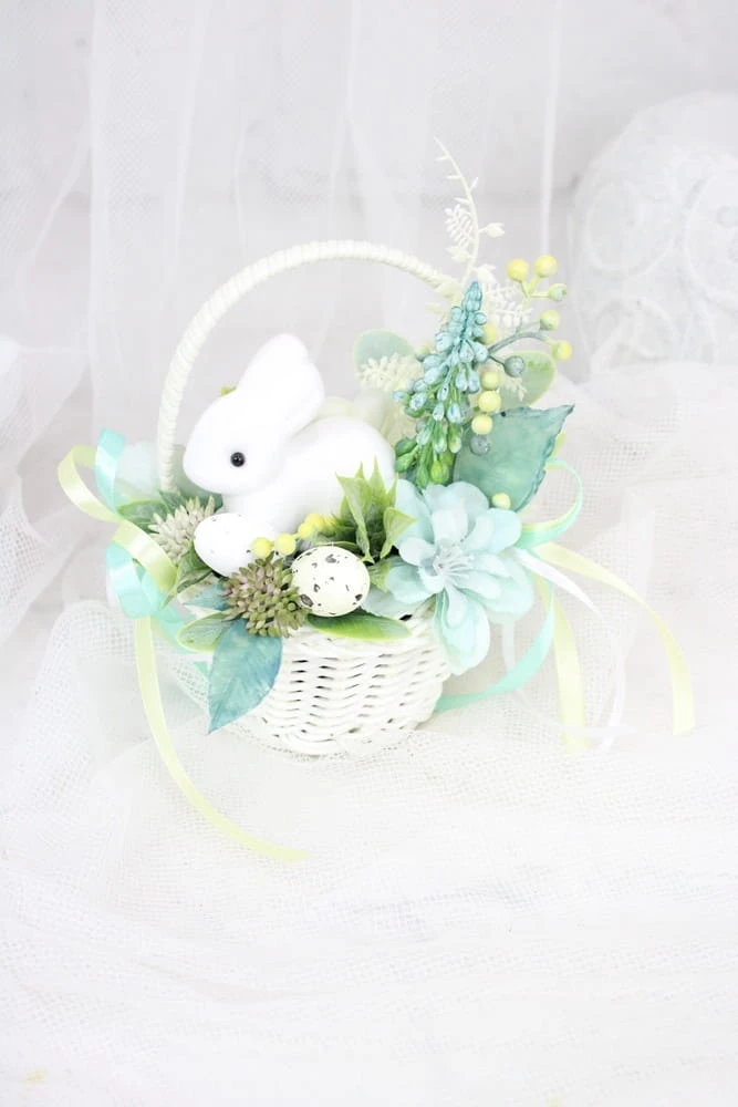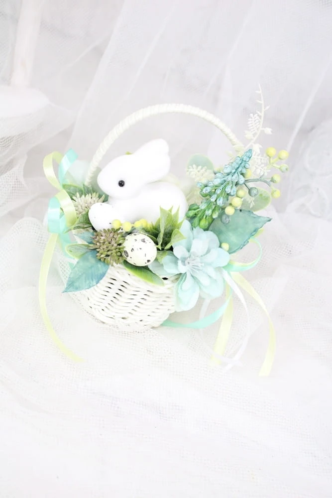 Udekorowany naturalnie wyglądającymi kwiatami i innymi gałązkami oraz pięknymi dodatkami, idealnie wpisujący się w obecne trendy. Dodatkowo uroku dodaje mu słodki zajączek.