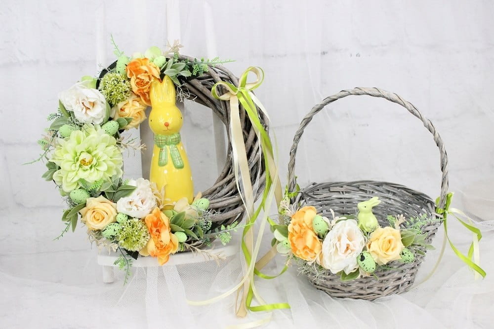 W ofercie posiadamy również stroiki i wianki wielkanocne w podobnym stylu, same ozdoby na koszyk wielkanocny lub inne koszyki z gotową dekoracją.
