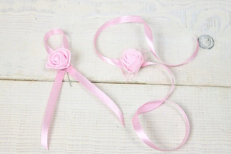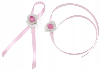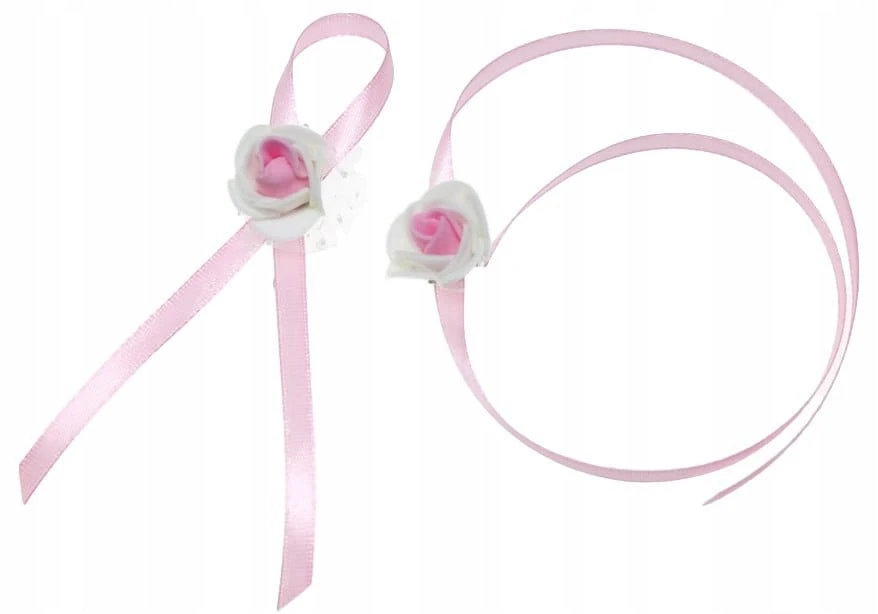 Wykonany z delikatnej róży zdobionej tiulem dopasowanym kolorystycznie, upiętej na tasiemce satynowej.
