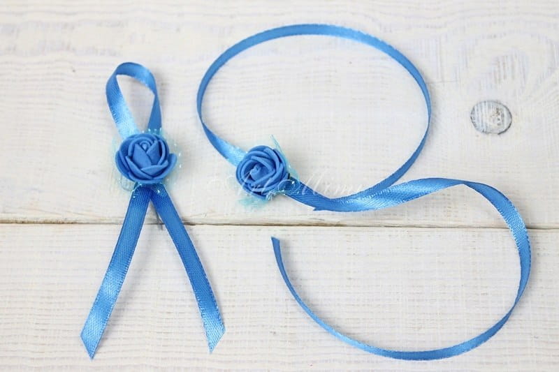 Wykonany z delikatnej róży zdobionej tiulem dopasowanym kolorystycznie, upiętej na tasiemce satynowej.