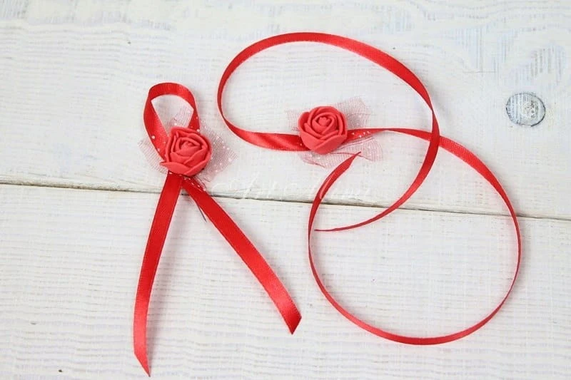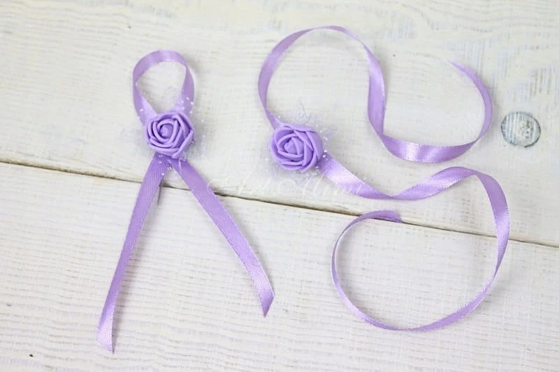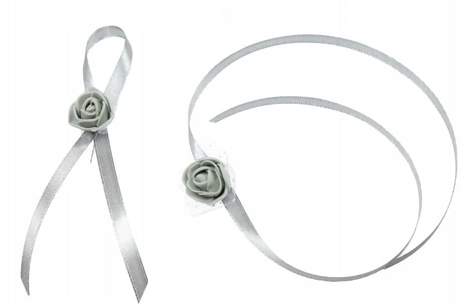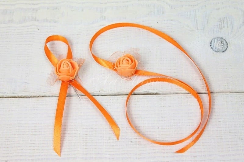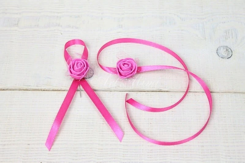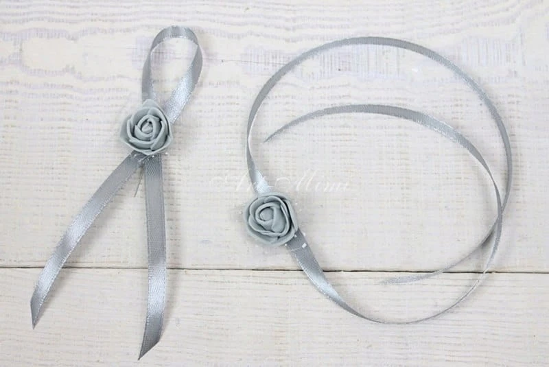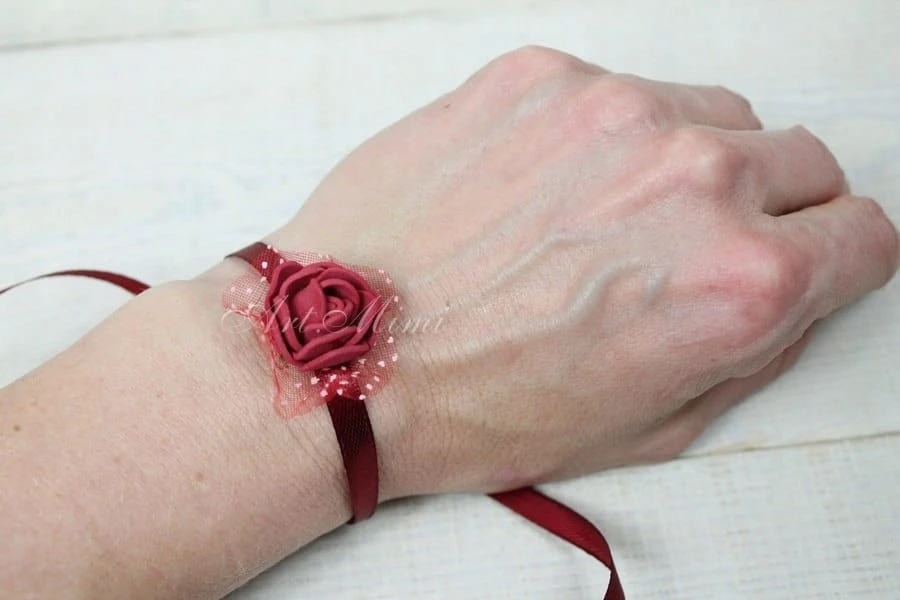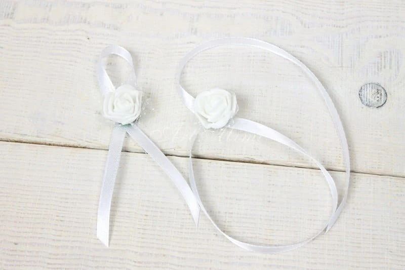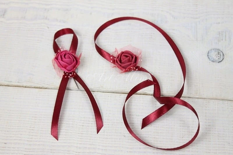 Wykonany z delikatnej róży zdobionej tiulem dopasowanym kolorystycznie, upiętej na tasiemce satynowej.