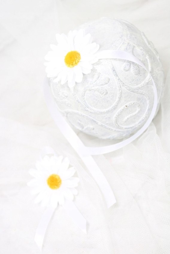 Wykonane z kwiatów rumianka, wszystko upięte na tasiemkach satynowych.