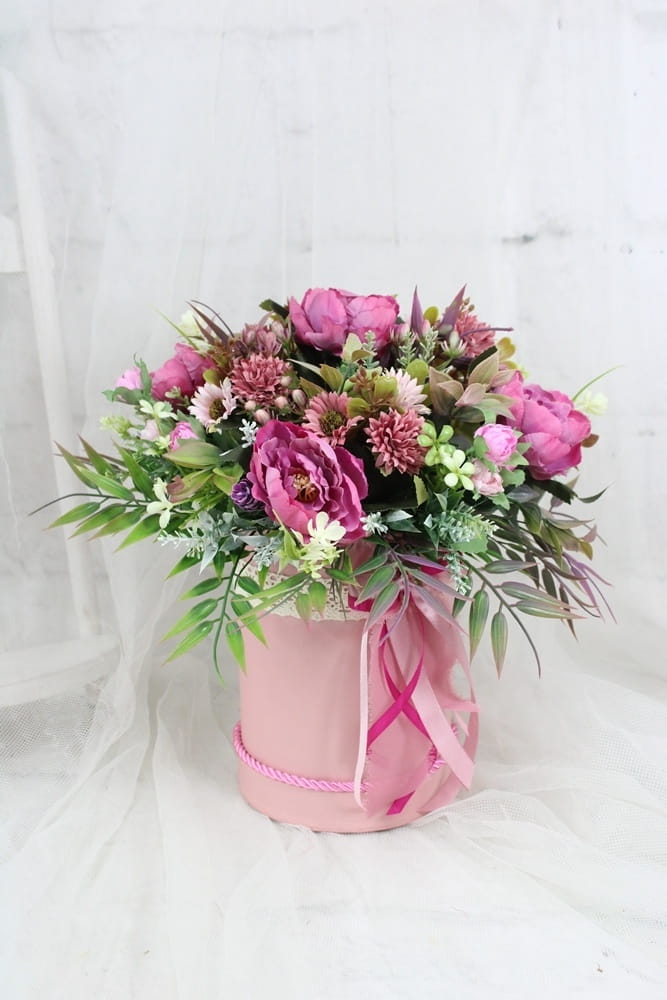 Piękna elegancka i niepowtarzalna kompozycja kwiatowa w eleganckim pudełku.