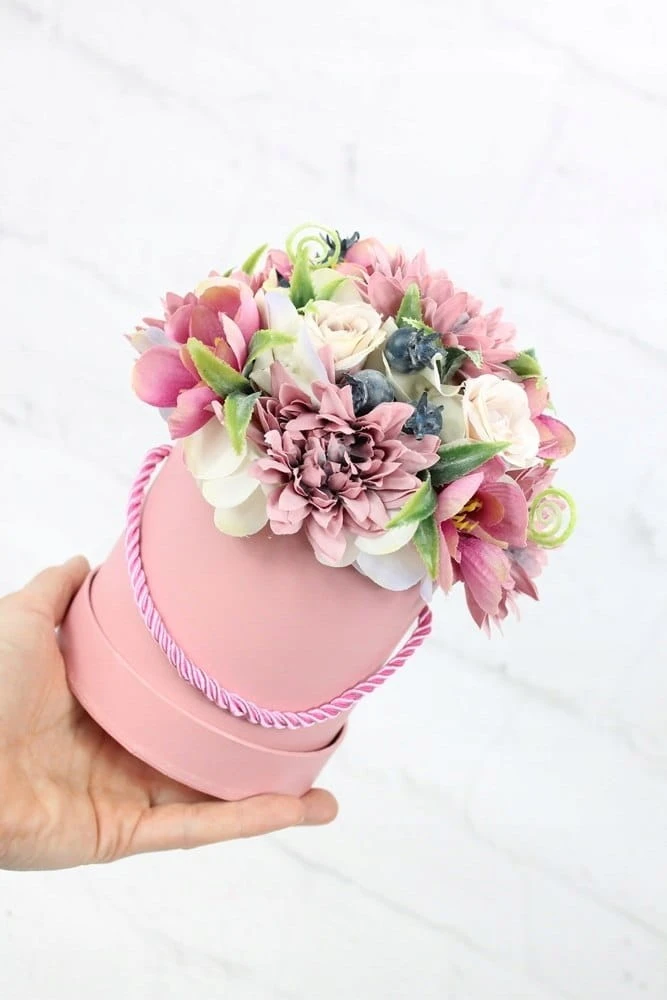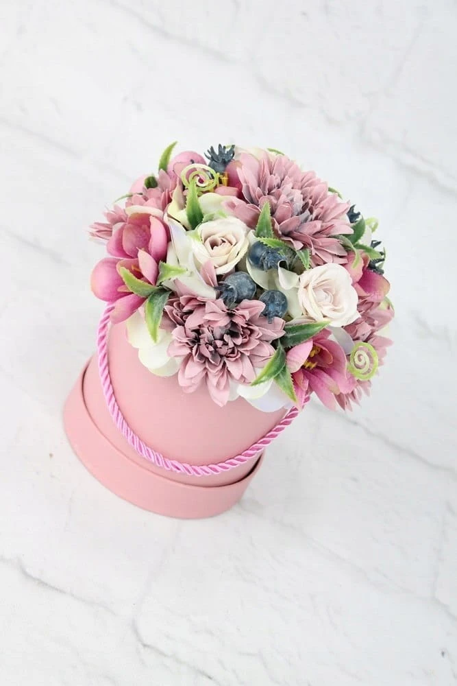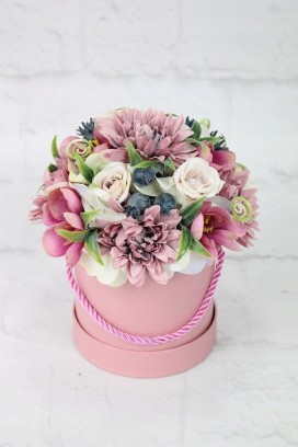 Piękna elegancka i niepowtarzalna kompozycja kwiatowa w eleganckim pudełku.