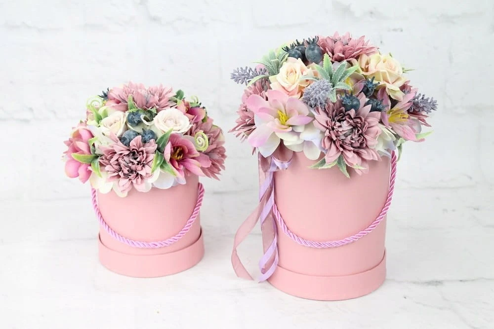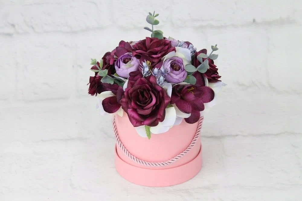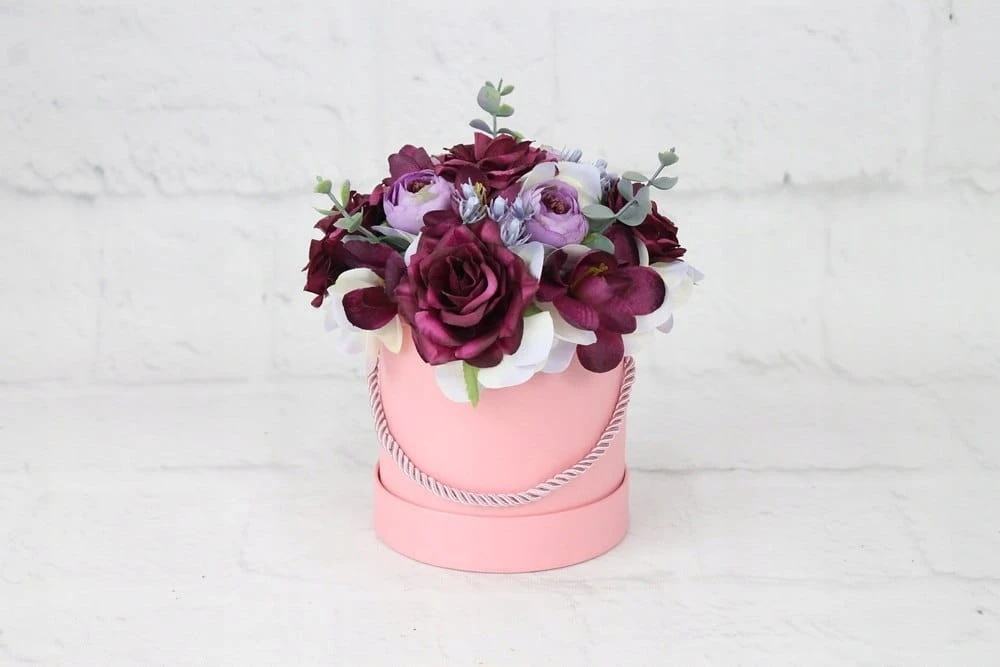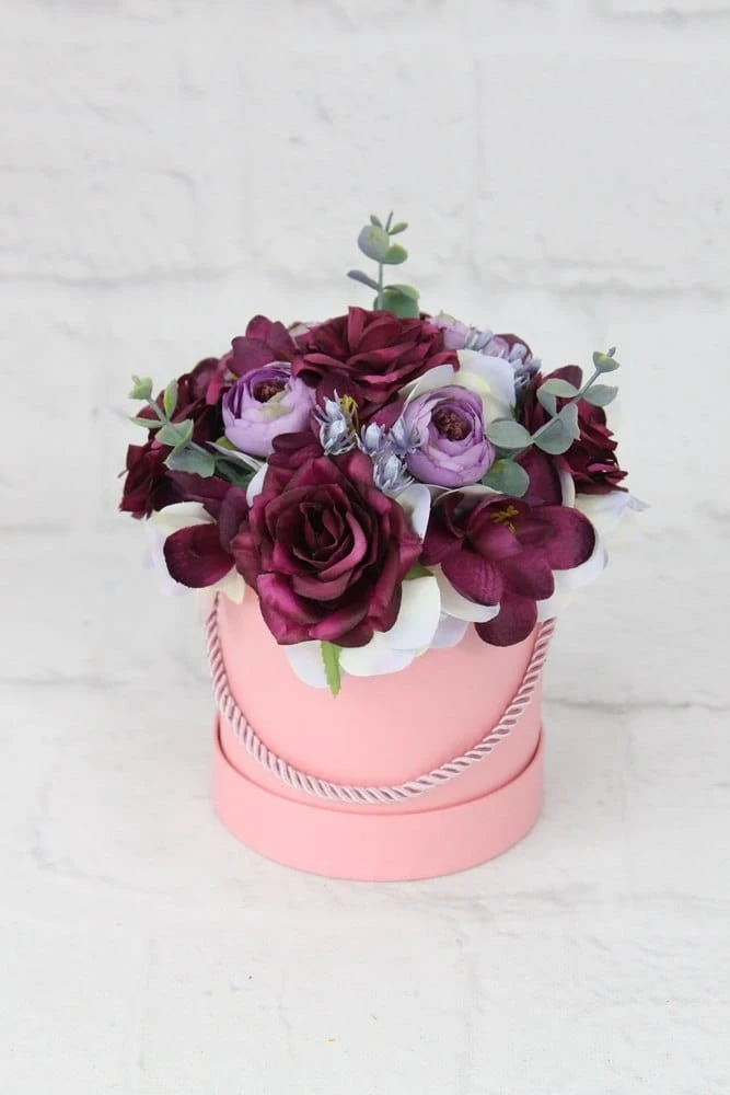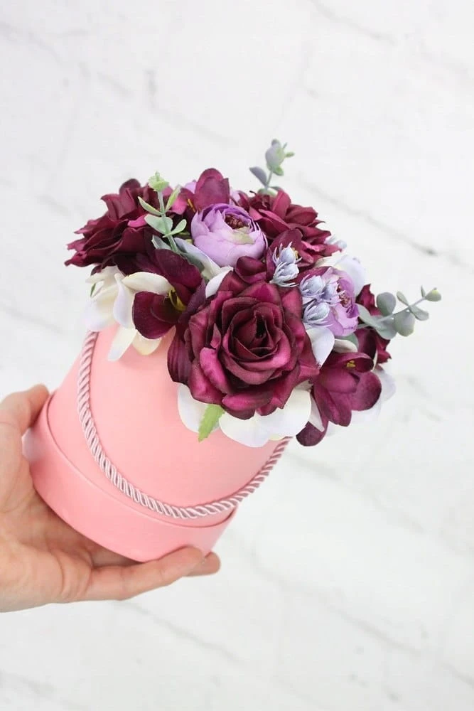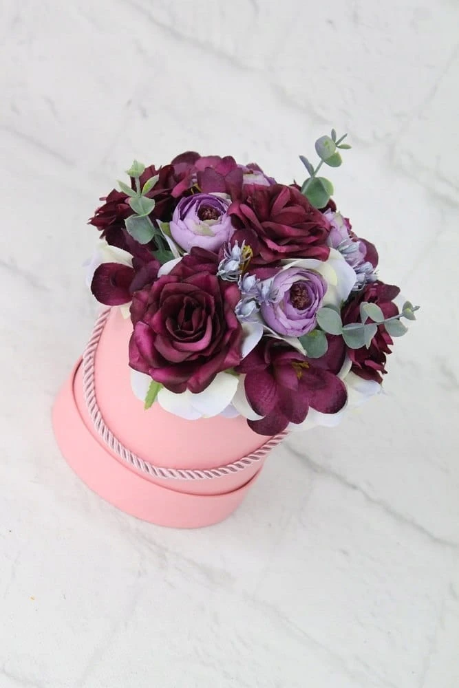 Kwiatowy flowerbox pachnąca dekoracja kwiatowa na prezent PURPURA