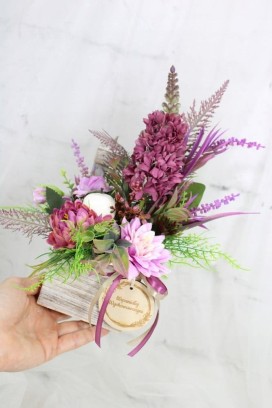 Udekorowana naturalnie wyglądającymi sztucznymi kwiatami w tonacji ciepłego różu, dekoracyjnymi gałązkami oraz pięknymi dodatkami, idealnie wpisującymi się w obecne trendy.