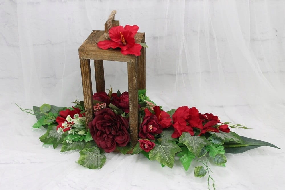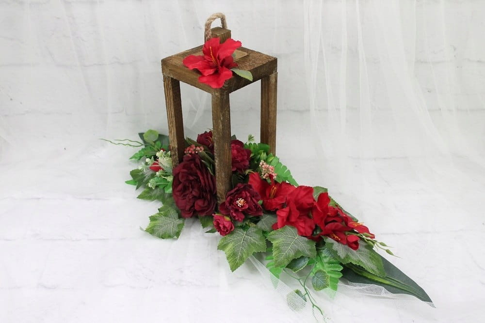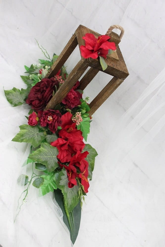 Piękna niepowtarzalna i oryginalna kompozycja nagrobna w drewnianym w lampionie, wykonana z wysokiej jakości sztucznych kwiatów.