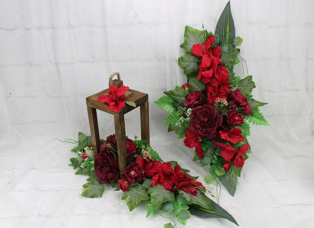 Całość jest utrzymana w tonacji czerwieni i bordo z dodatkiem zieleni dekoracyjnych liści i traw idealnie wpisujących się w obecne trendy sezonu.