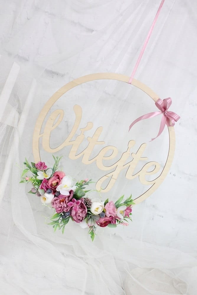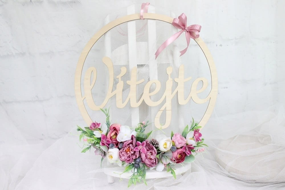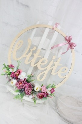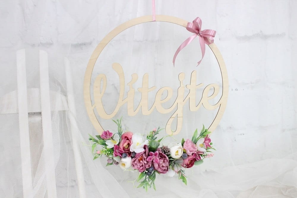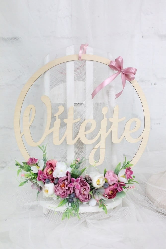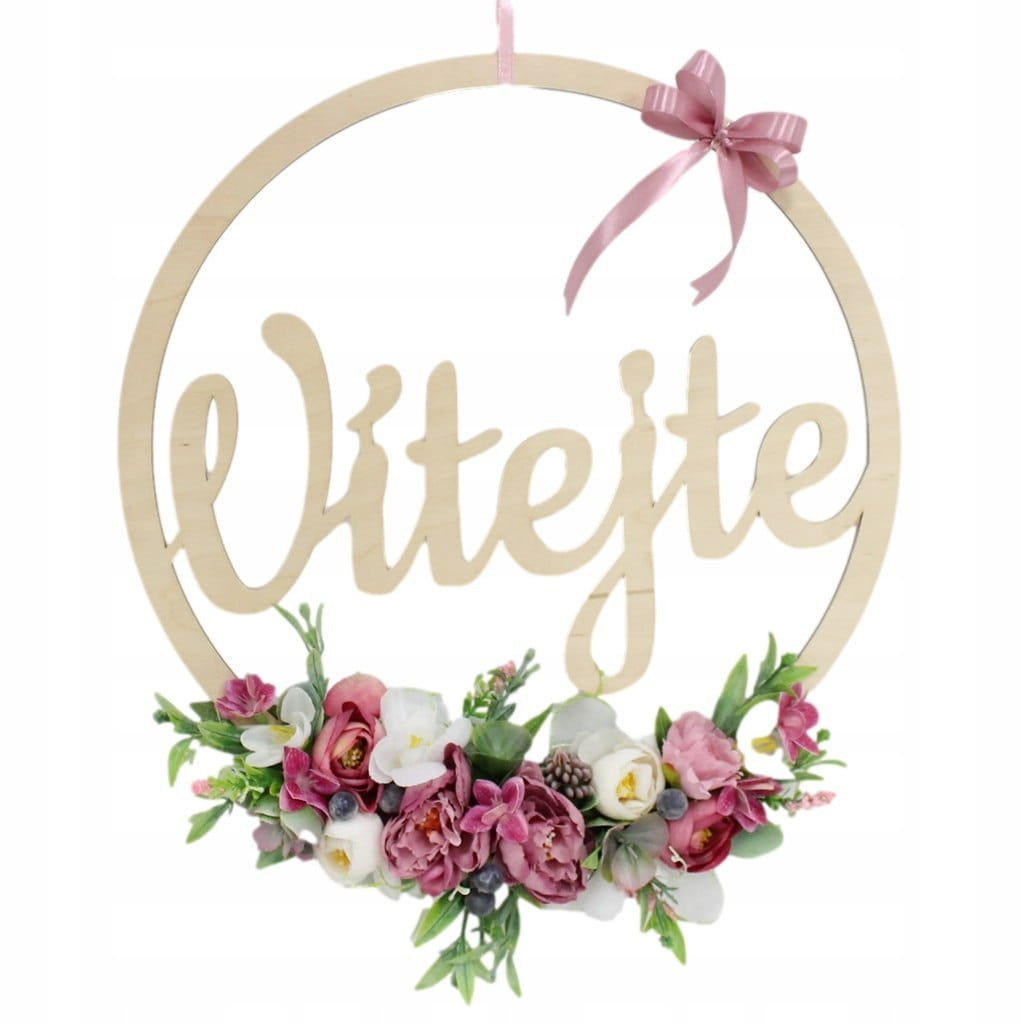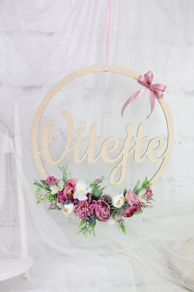 Piękna, oryginalna kwiatowa dekoracja wykonana na drewnianej obręczy o średnicy 35cm z napisem Vitejte.
