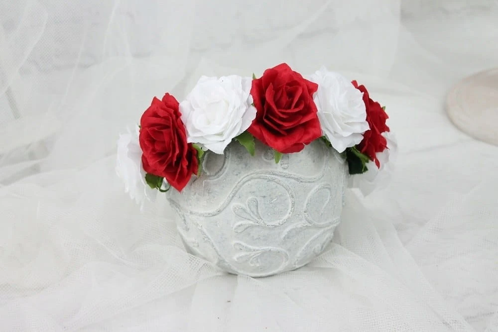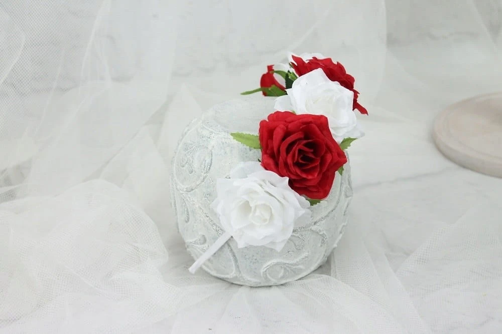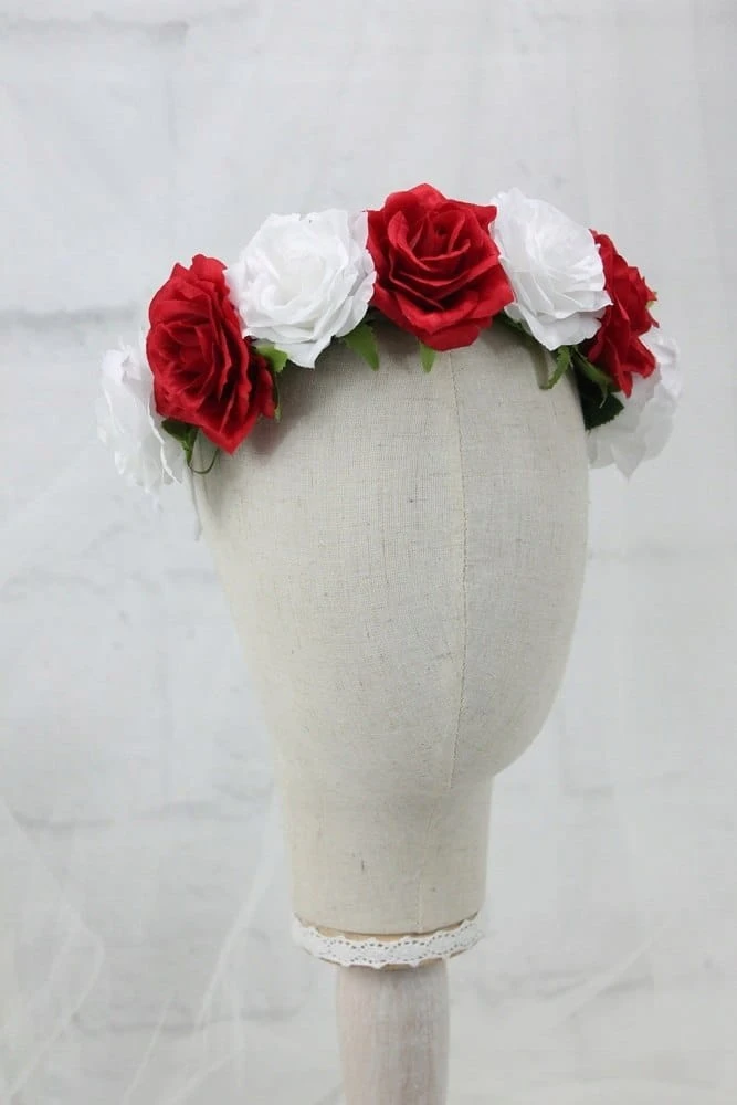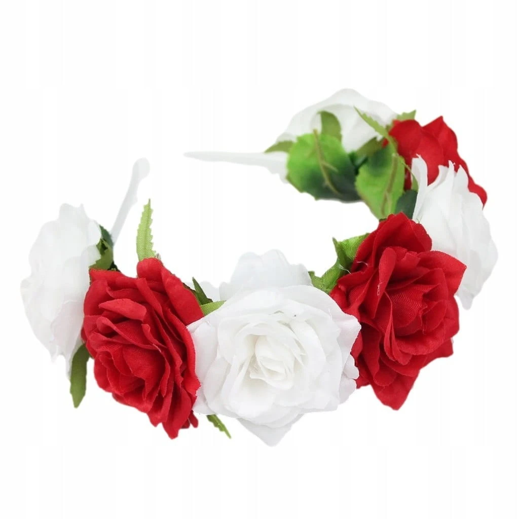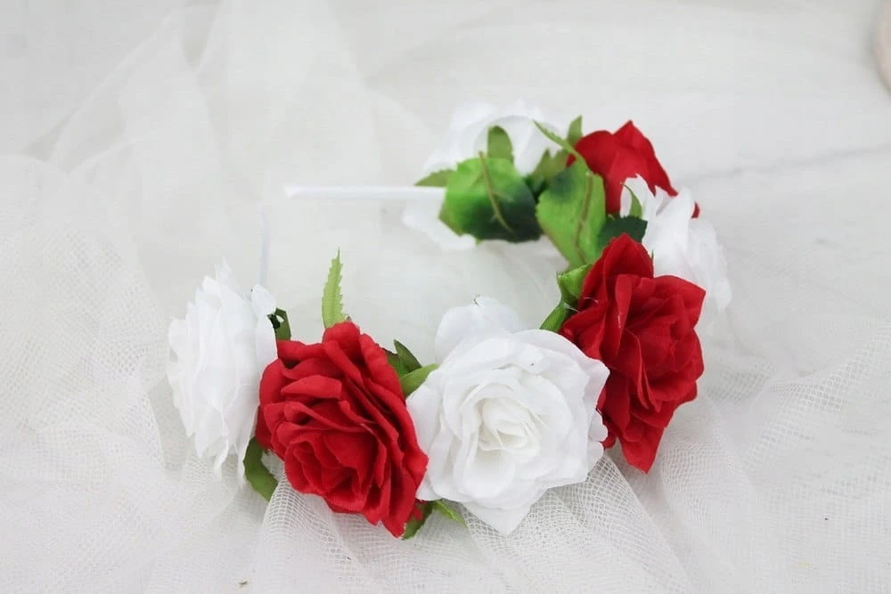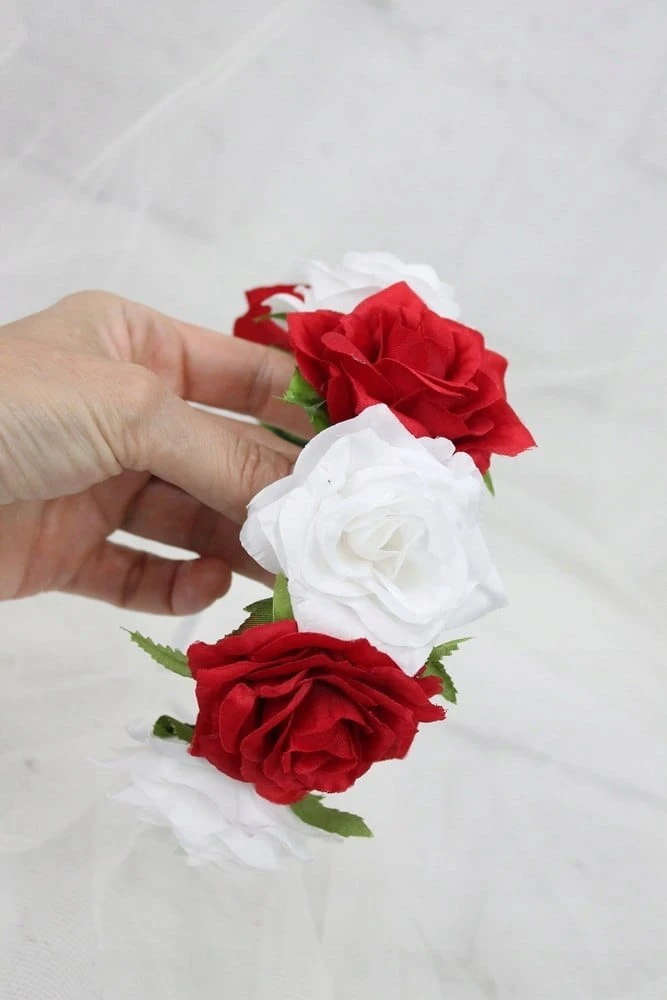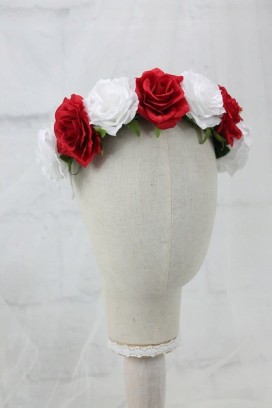 Niezwykle piękna opaska,wykonana z lekko błyszczących satynowych róż w kolorze bieli i czerwieni, zdobiony delikatnie listkami.