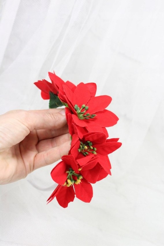 Wykonana z czerwonych welwetowych kwiatów gwiazdy betlejemskiej..