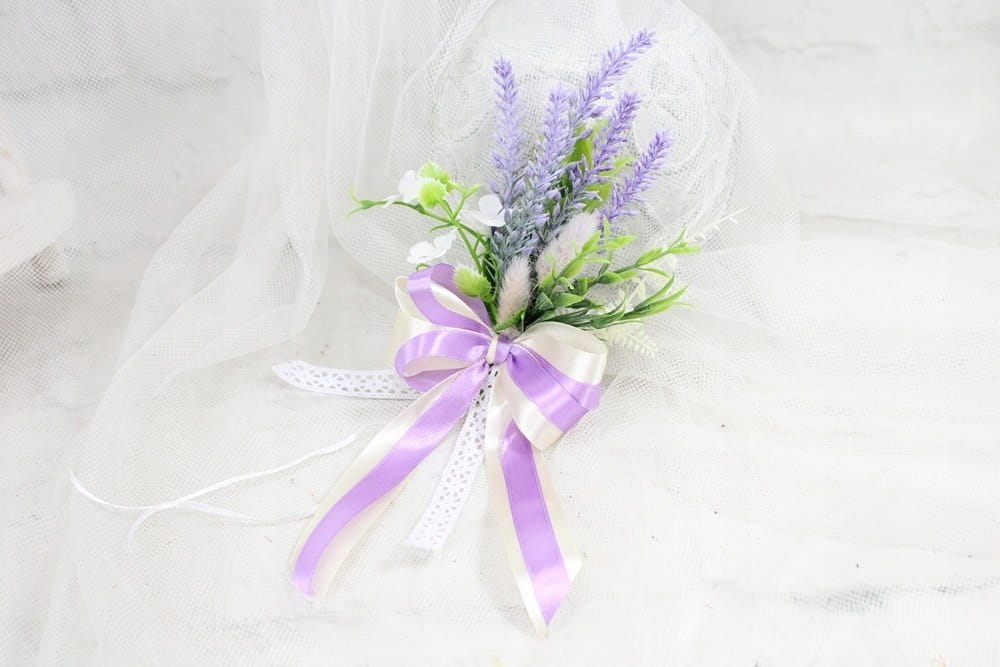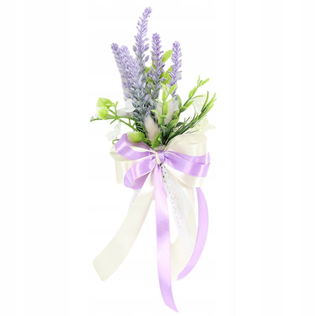 Wykonana z gałązek lawendy delikatnych traw i satynowych tasiemek Wymiary kokardki około 29cm/12cm