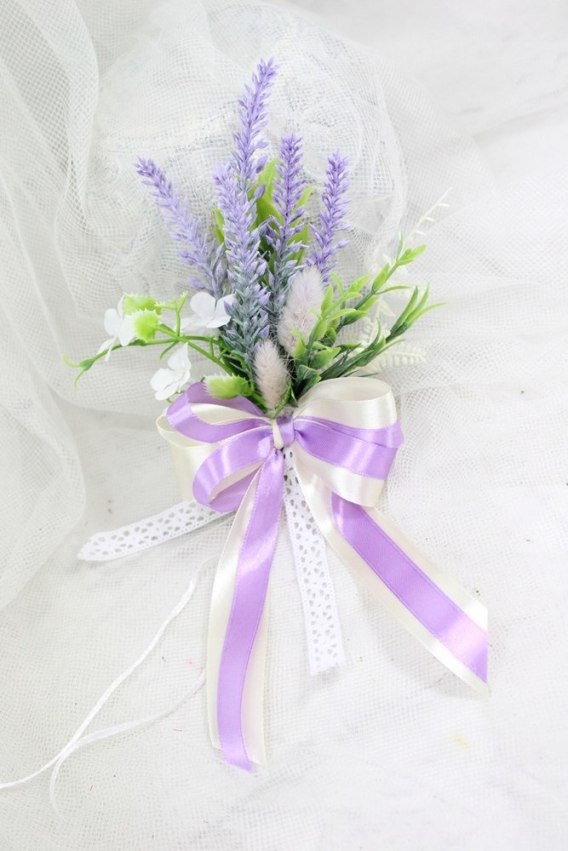 Delikatna stylowa i efektowna gałązka lawendowa z kokardką na koszyk wielkanocny.