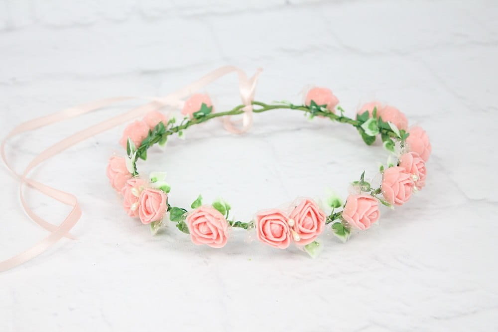 Delikatna ozdoba na świecę, wykonana z różyczek otulonych tiulem z zielonymi listkami bluszczu których kształt przypomina serduszka, delikatnie zdobiona perełkami.