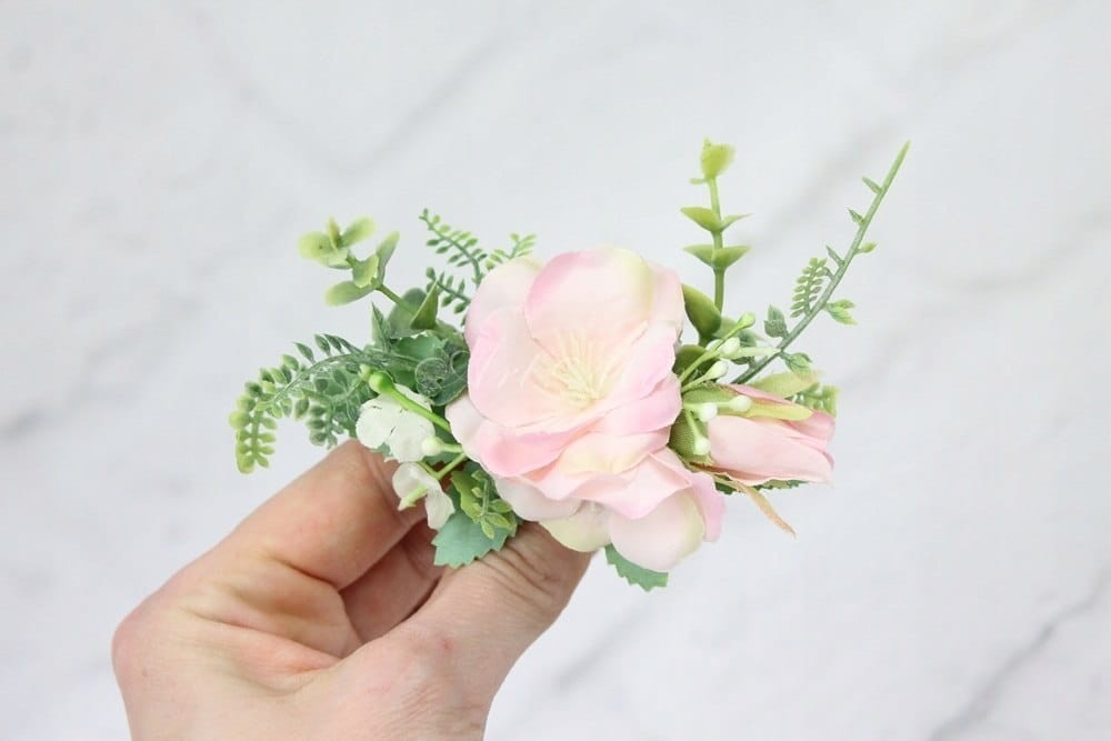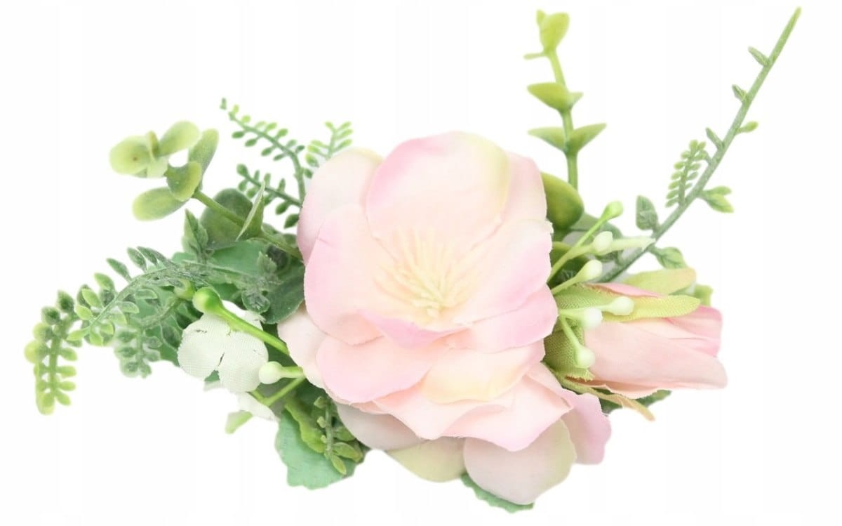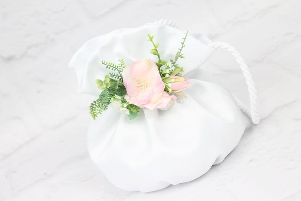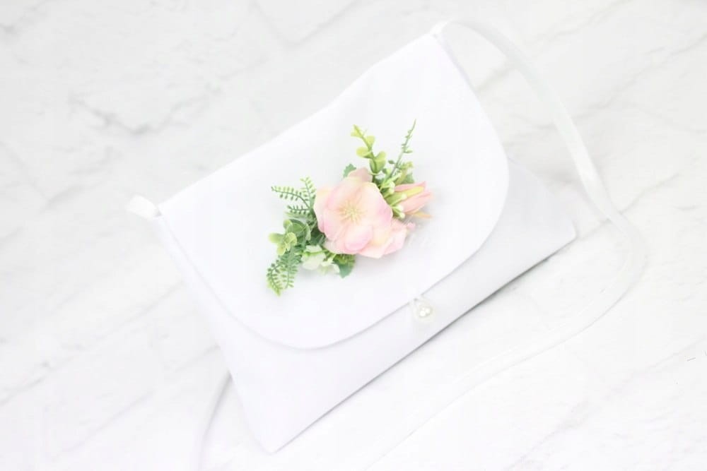 Stylowa i urocza ozdoba na torebkę komunijną, wykonana z kwiatów i pąków wiśni, delikatnej gipsówki oraz eleganckich zielonych dodatków traw, idealnie wpisujących się w obecne trendy.