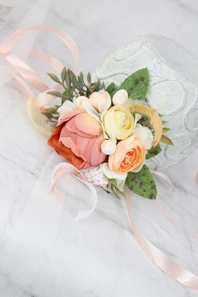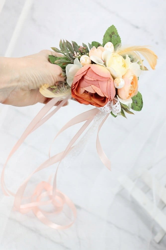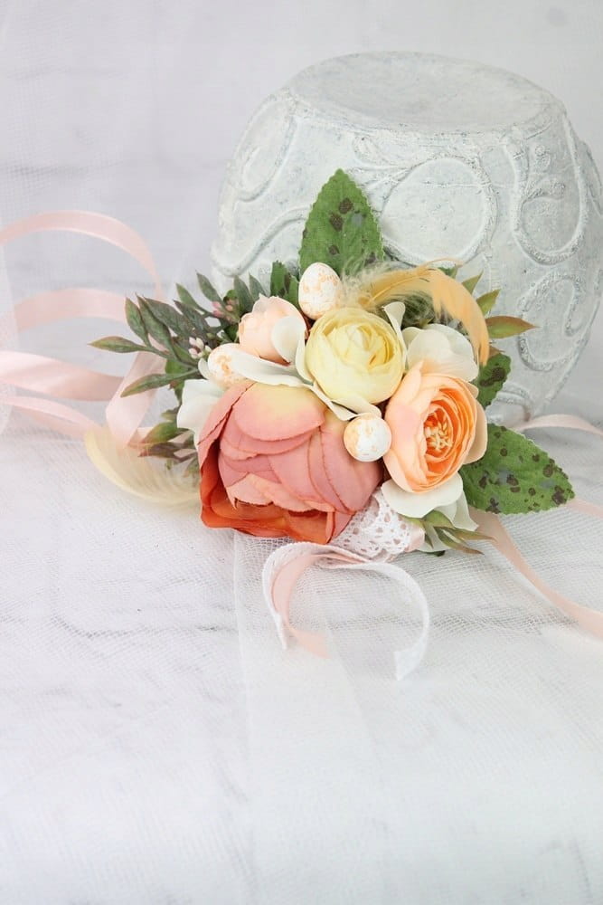 Wykonana z pięknych kwiatów i pąków wiosennych kwiatów w cudownych odcinaniach ozdobiona jajkami, piórkami, dekoracyjnymi listkami bluszczu oraz traw idealnie wpisującymi się w obecne trendy.