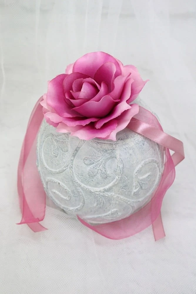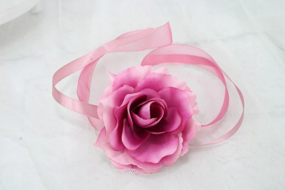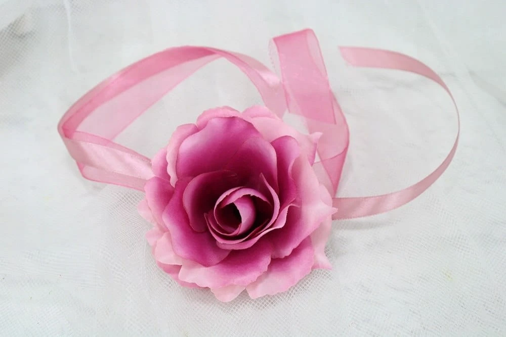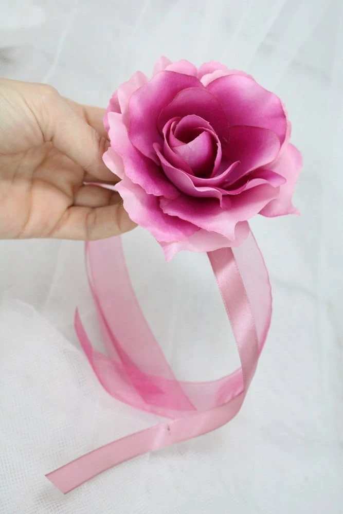 Wykonany z dużej satynowej róży, wszystko upięte na dwóch tasiemkach szyfonowej oraz satynowej kolorystycznie dopasowanej do kwiatów.