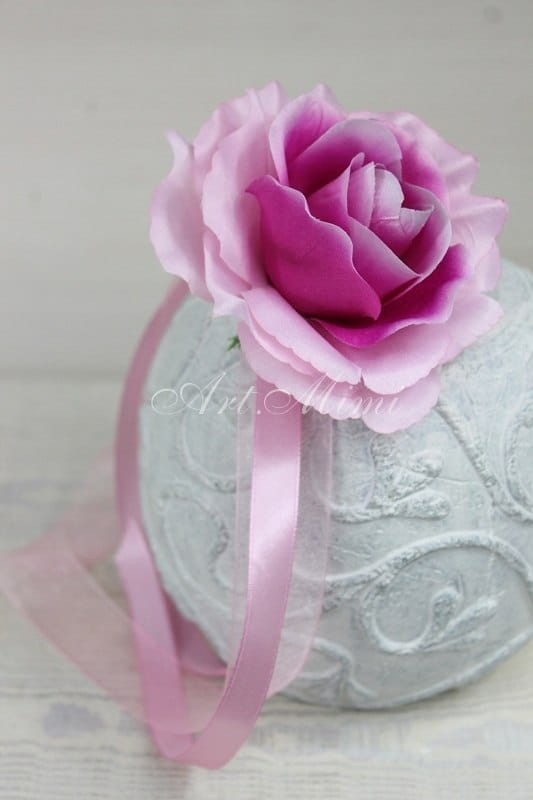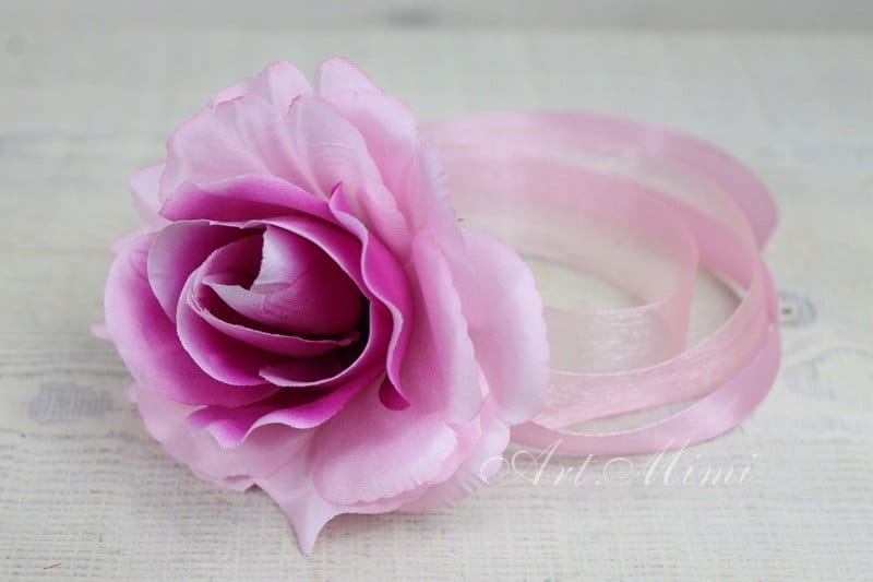 Wykonany z dużej satynowej róży w kolorze jasno różowym z