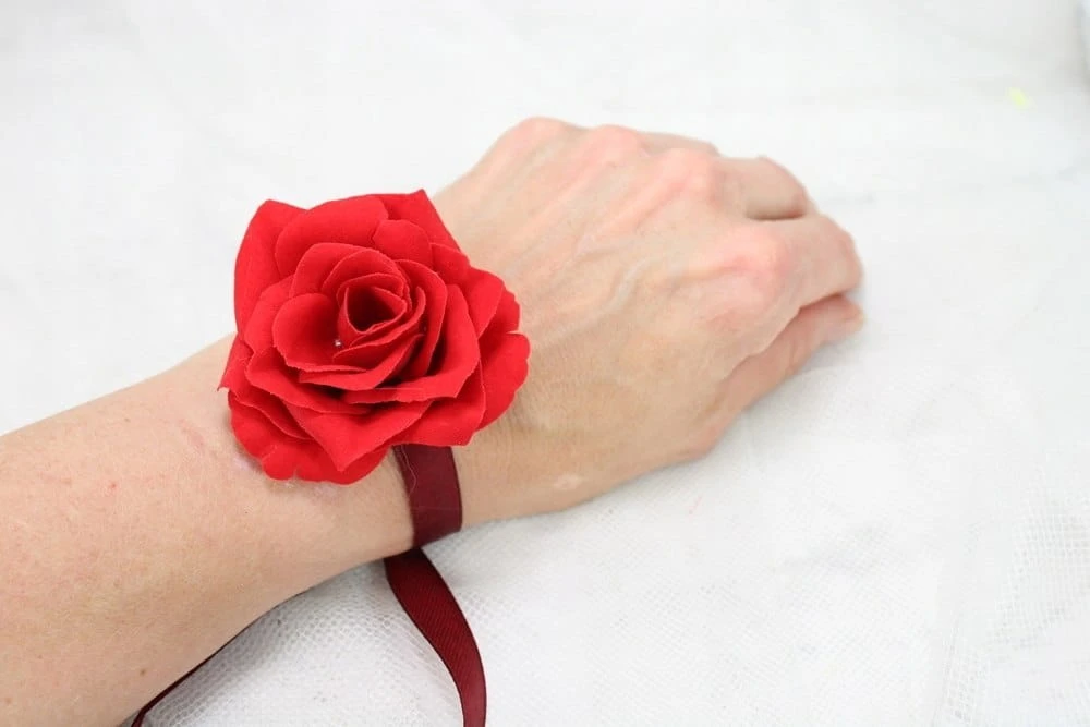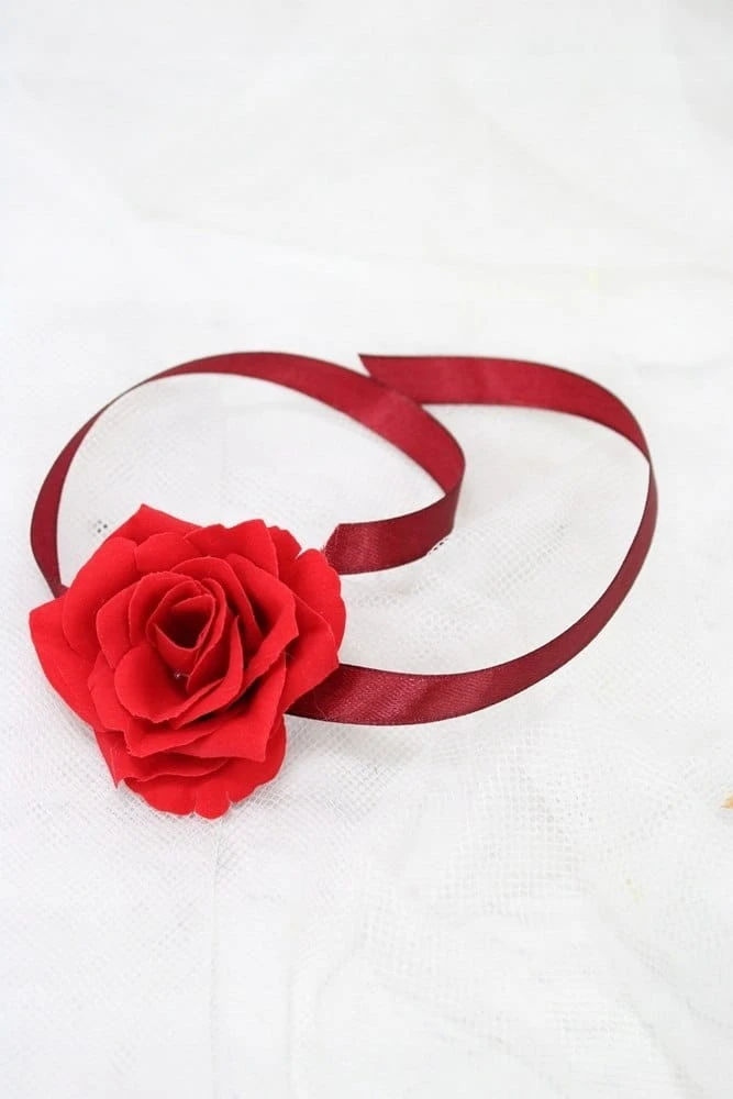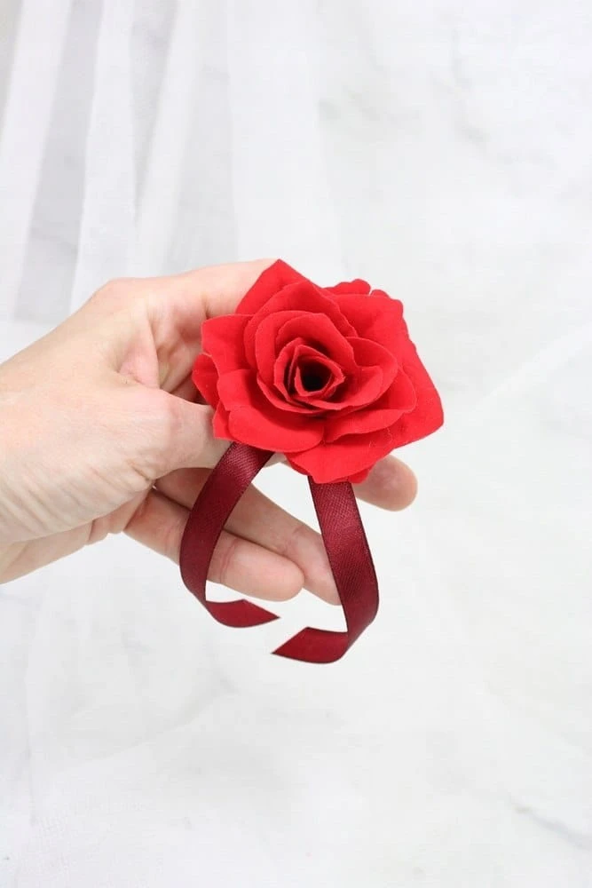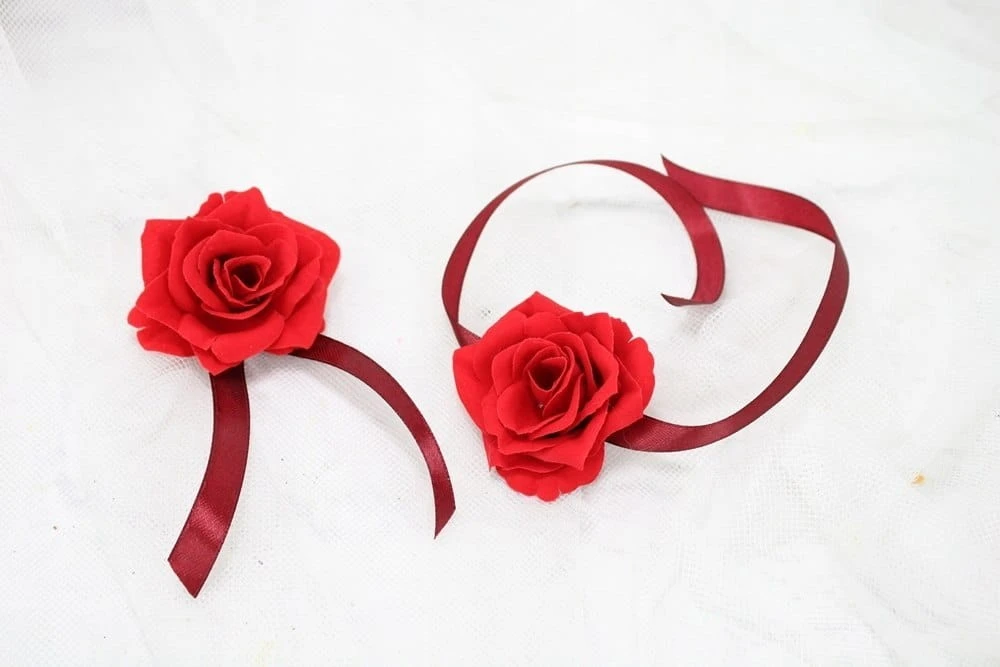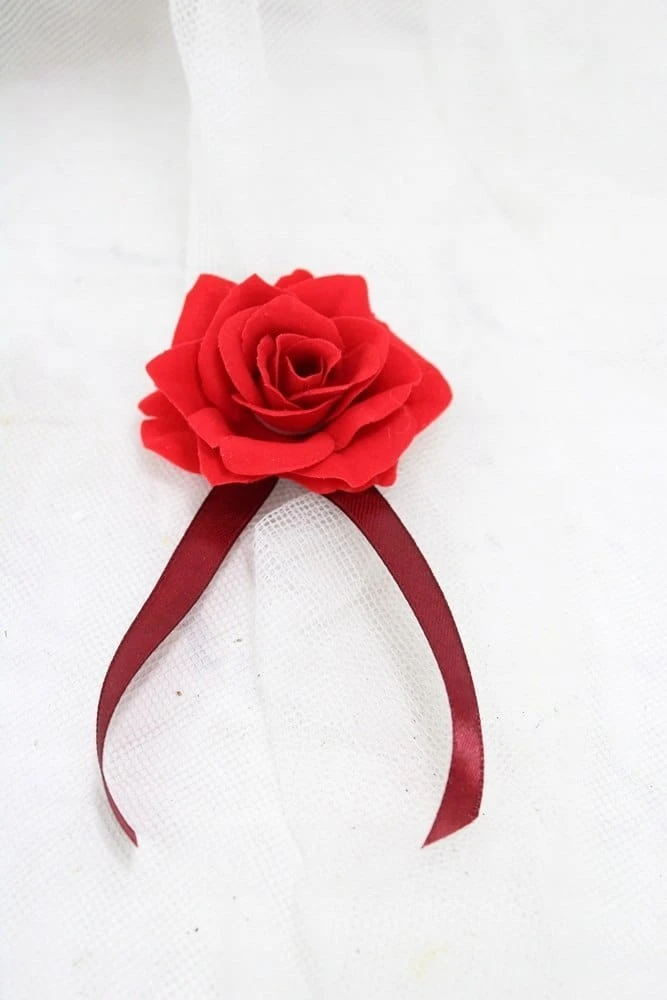Wykonane z kwiatów pięknej welwetowej róży o wykończeniu zamszowym, wszystko upięte na tasiemkach satynowych.