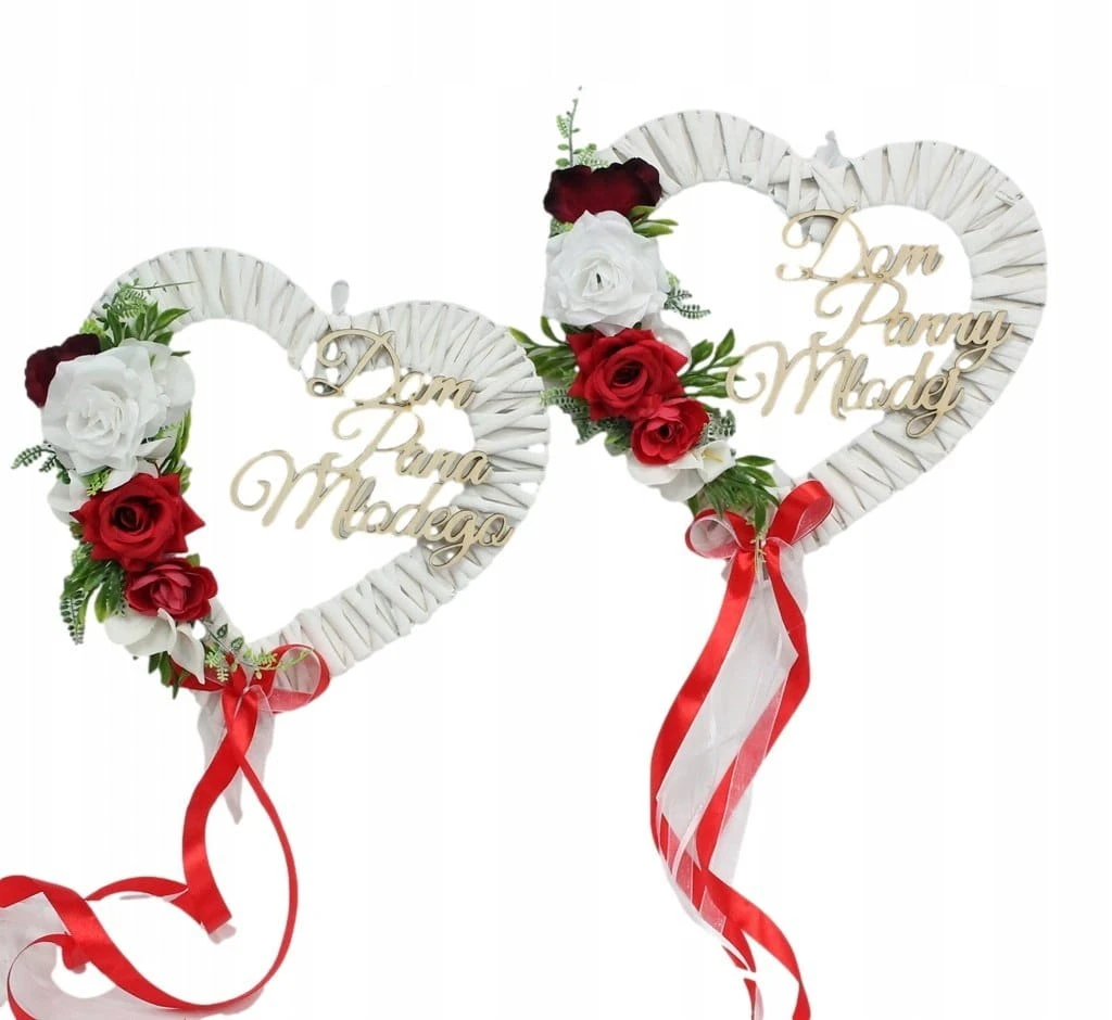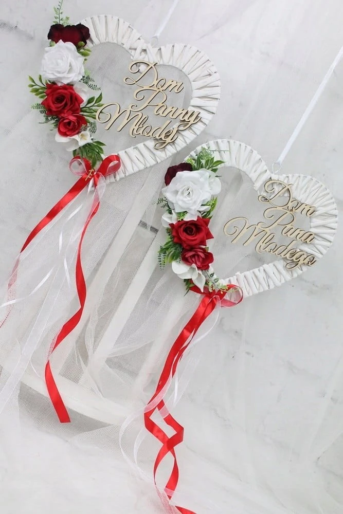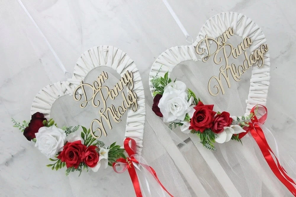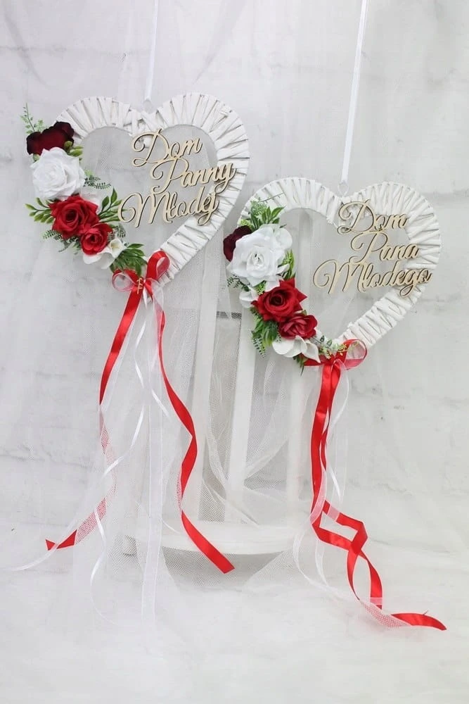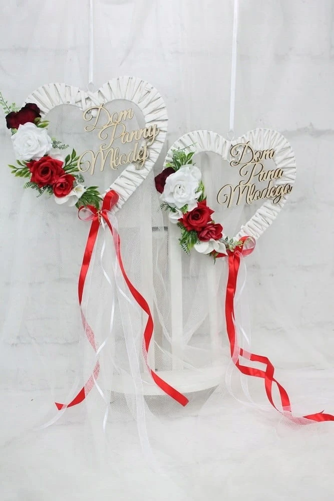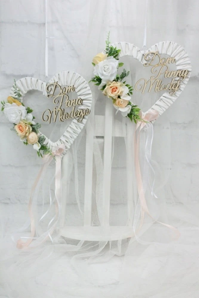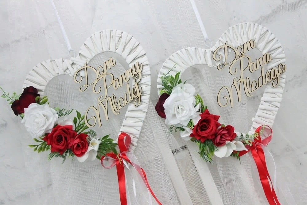 Dodatkowo ozdobione drewnianym napisem Dom Pana Młodego oraz Dom Panny Młodej.