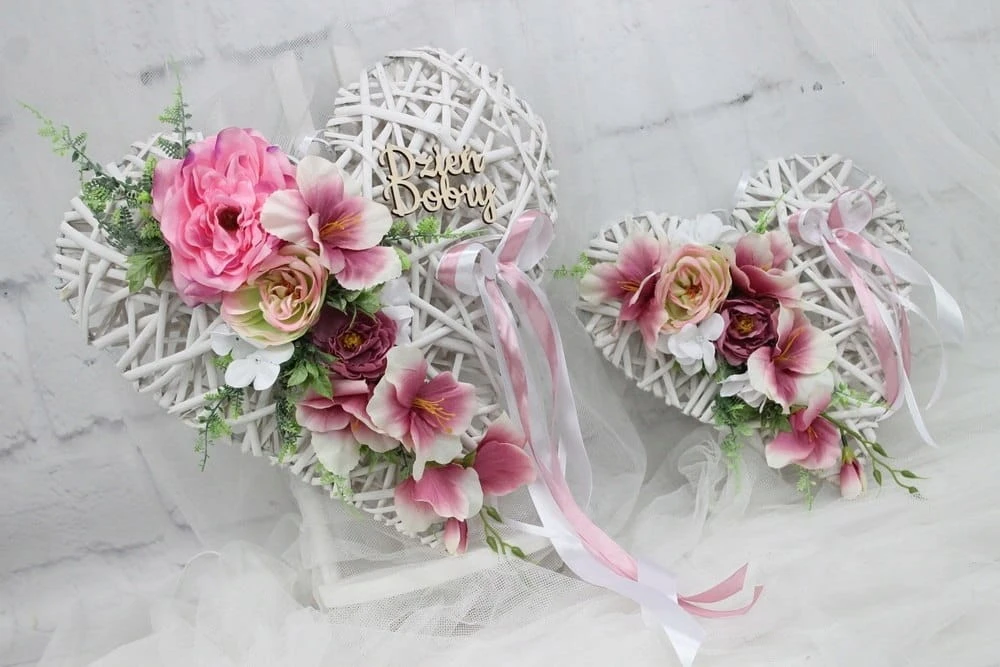 Zestaw serc wiklinowych o średnicy 25cm udekorowane kwiatami, liśćmi, dekoracyjną trawą idealnie wpisującą się w obecne trendy.