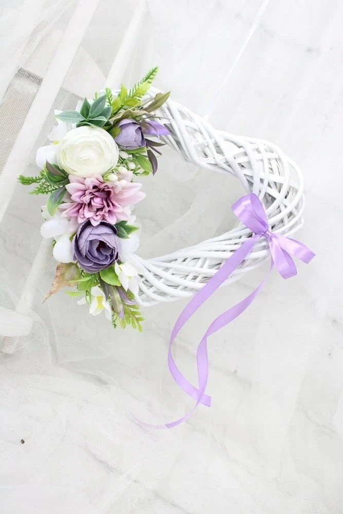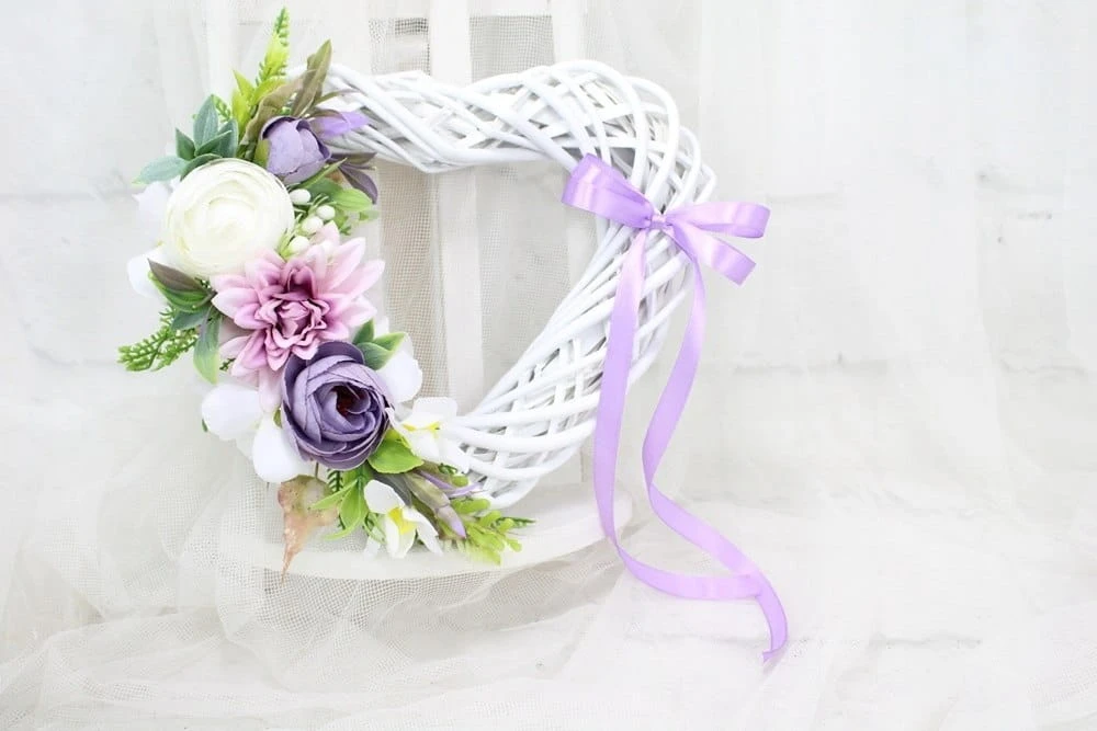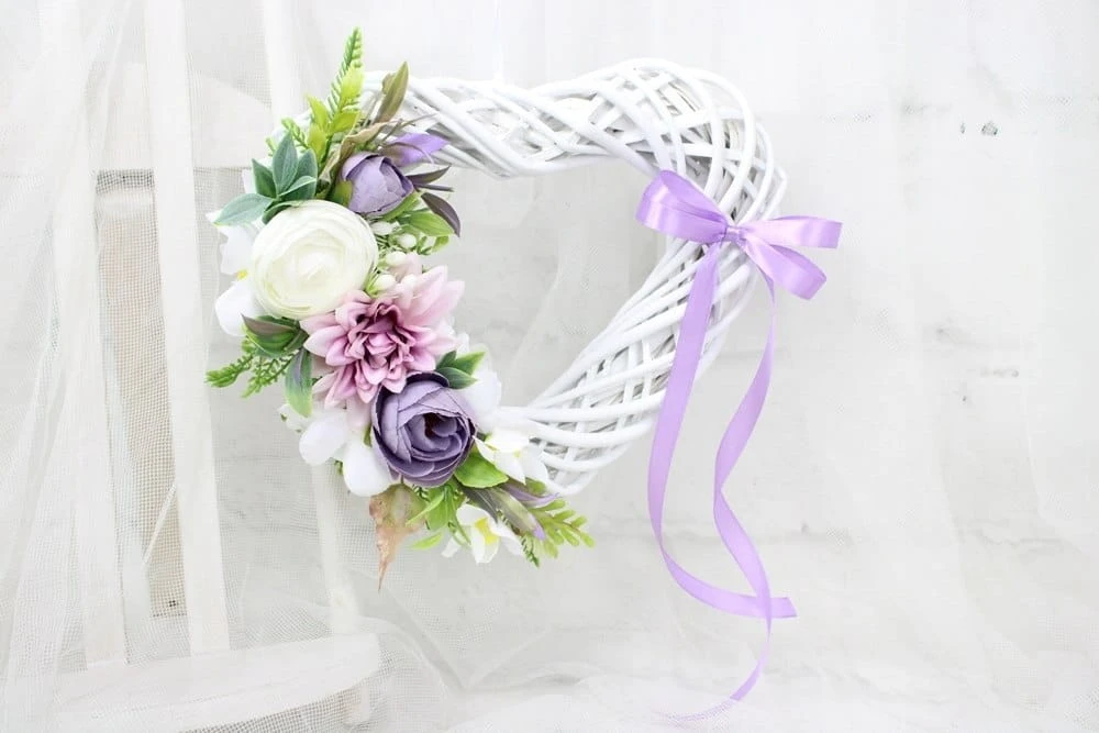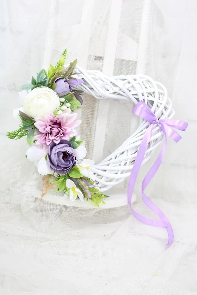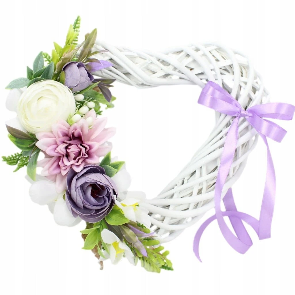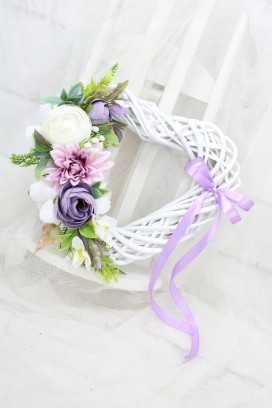 Dekoracja wykonana na bazie z wiklinowego serca o średnicy 25cm. Udekorowana pięknymi kwiatami w odcieniach kremu i fioletu.