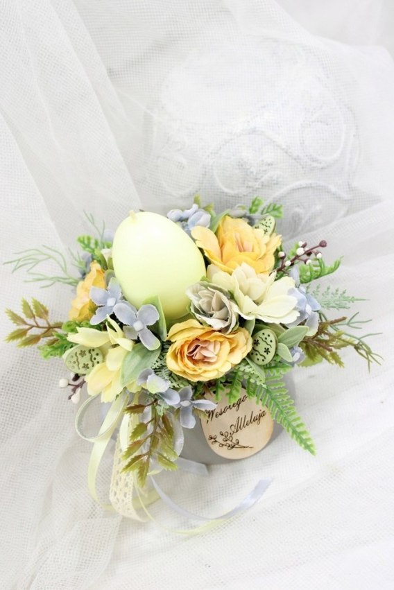 Ręcznie wykonany stroik wielkanocny w pastelowych kolorach z efektowną świecą w kształcie jajka. Kompozycja zdobiona wiosennymi kwiatami, zielenią oraz subtelnymi dodatkami tworzy wyjątkową, świąteczną dekorację do domu lub na stół.
