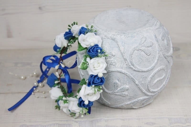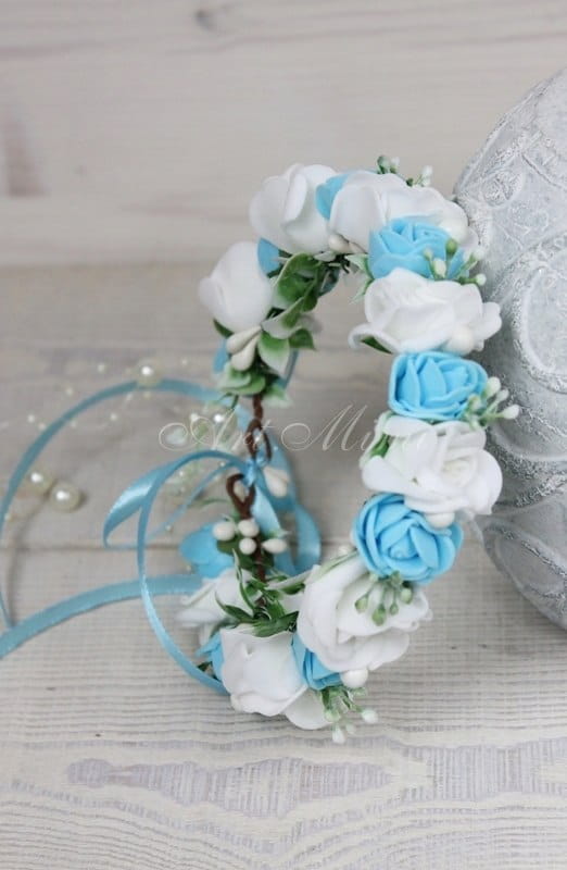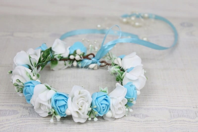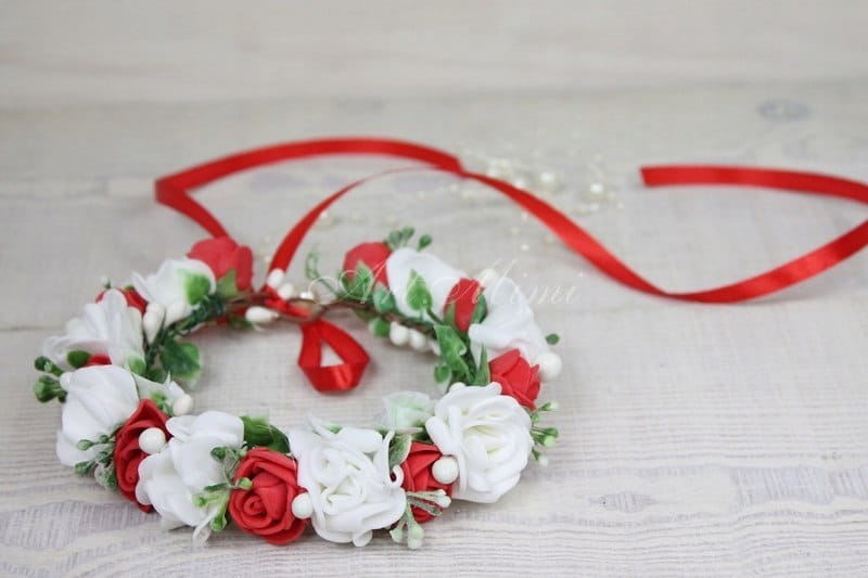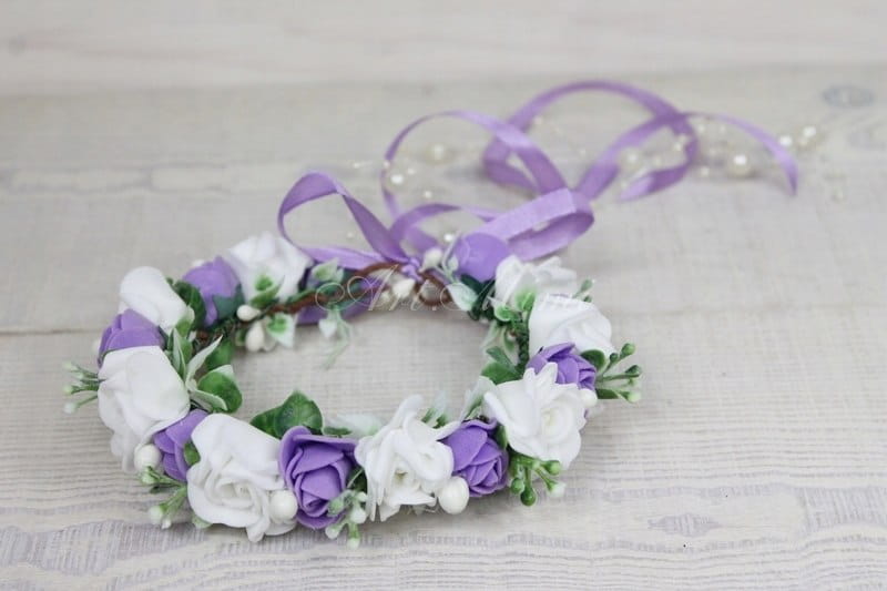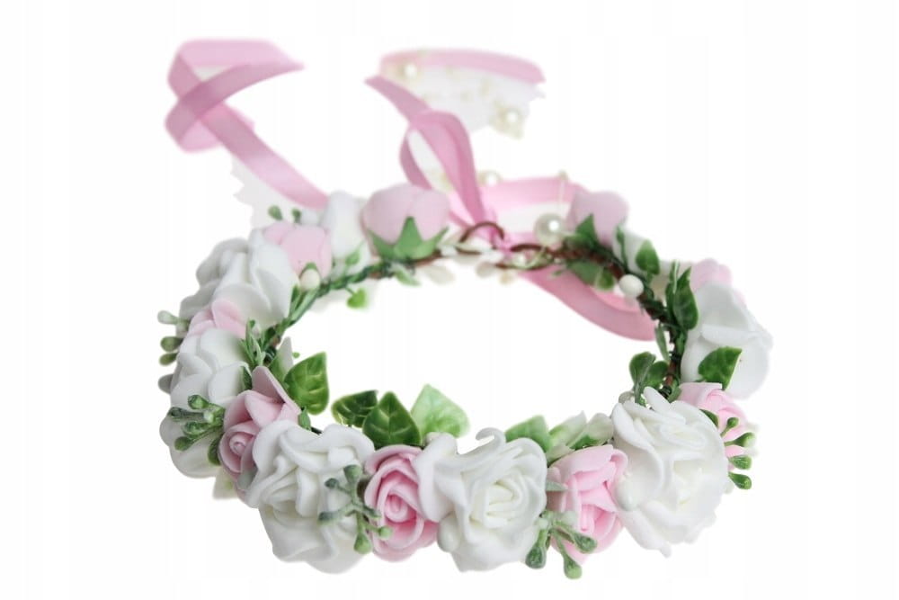 Wyjątkowy i uroczy wianuszek do koka, upleciony z kwiatów różyczek w wybranym kolorze z dodatkiem bluszczu, ozdobnej trawy. Piękną ozdobą jest również sznur perełek i tasiemek satynowych.