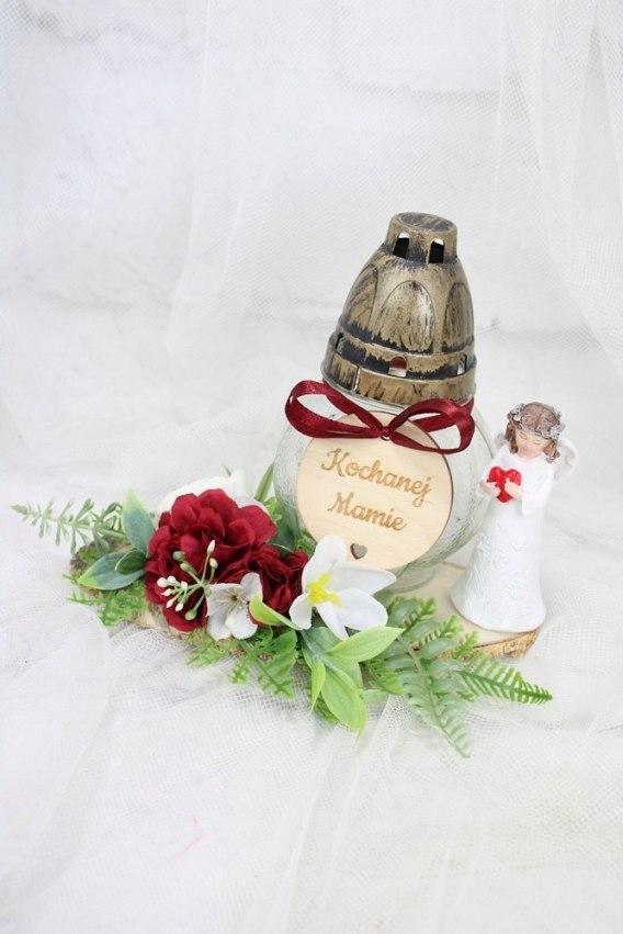 Wyjątkowości tej kompozycji dodaje piękny aniołek drewniany napis oraz znicz.