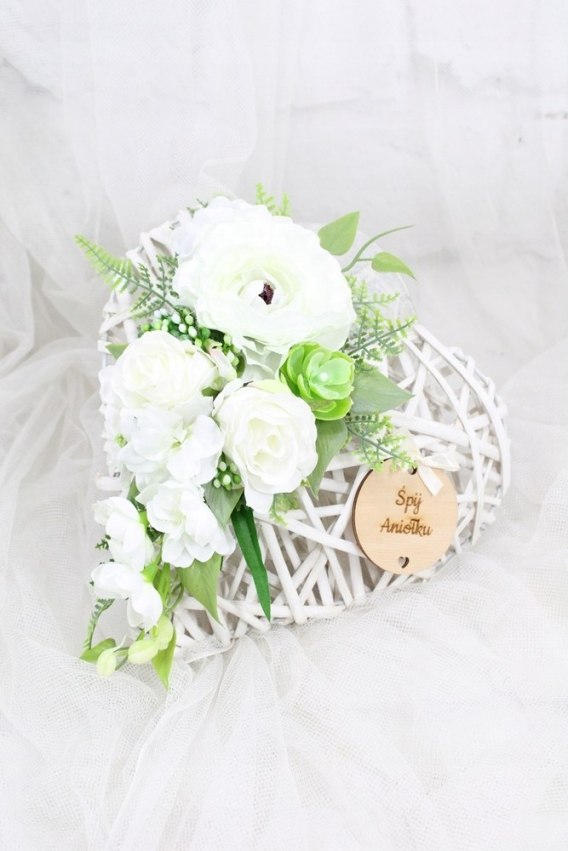 Niezwykła i oryginalna kompozycja nagrobna wykonana na wiklinowym sercu.