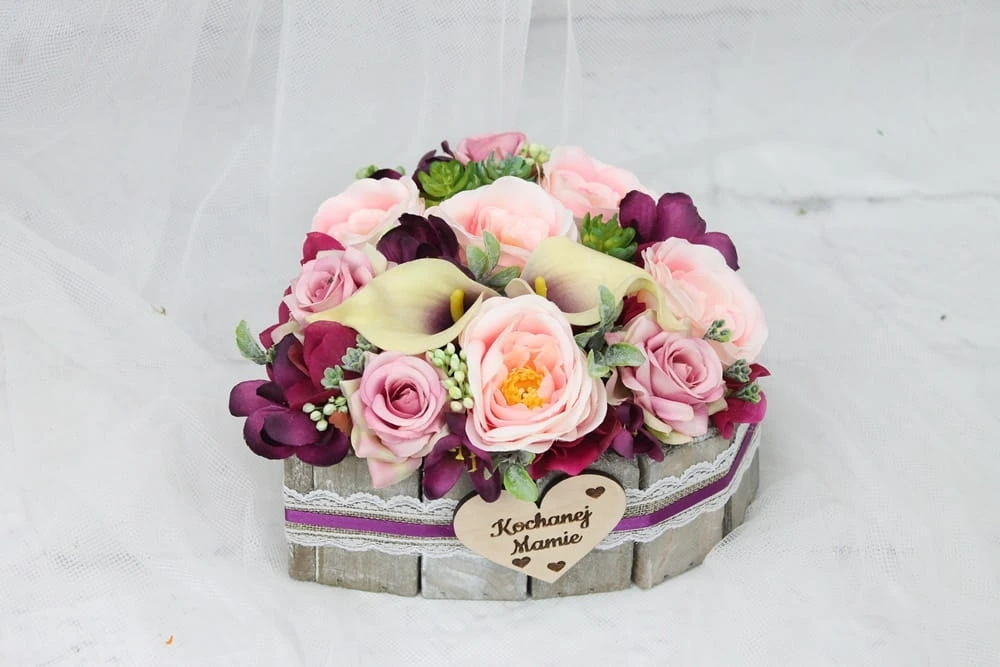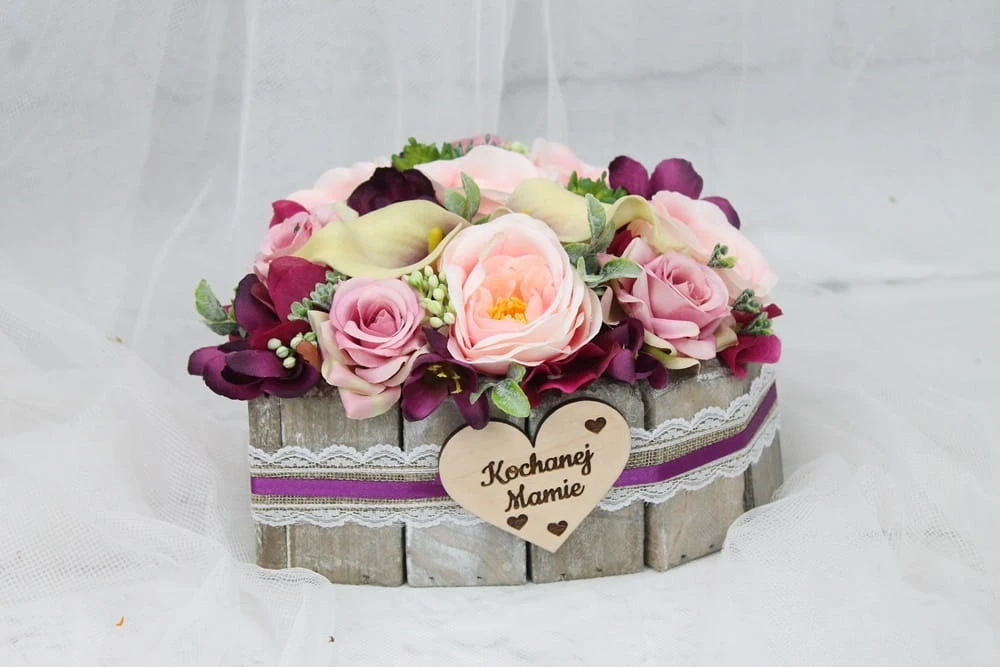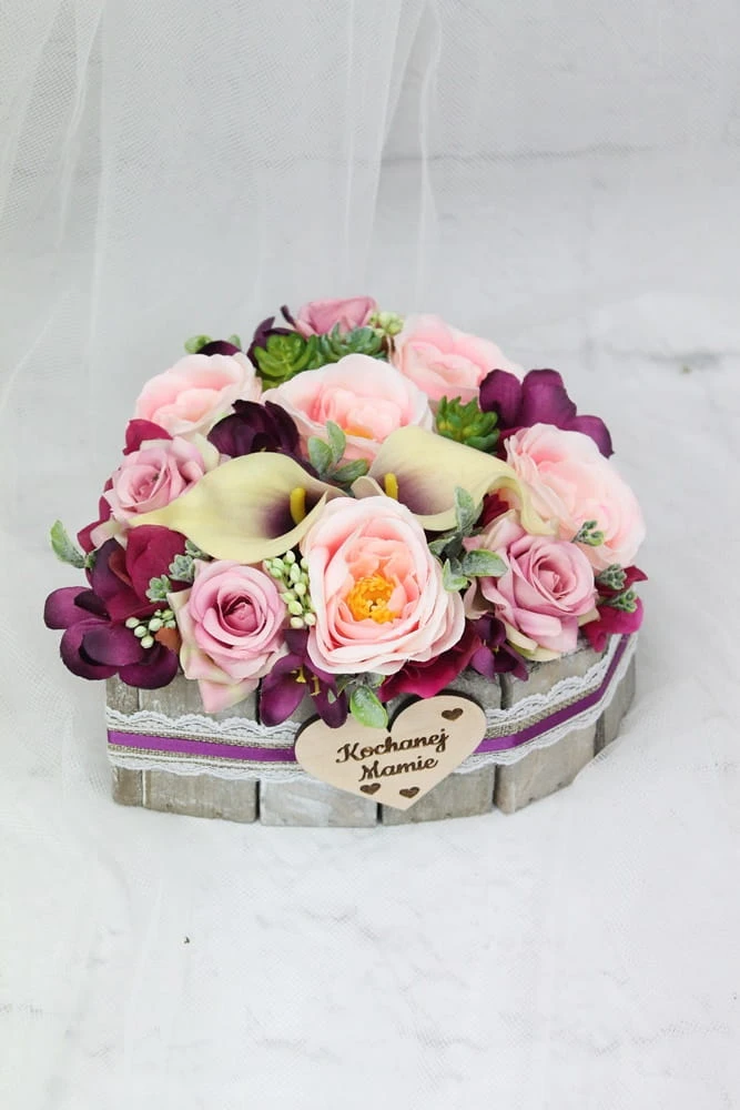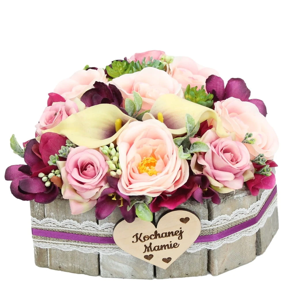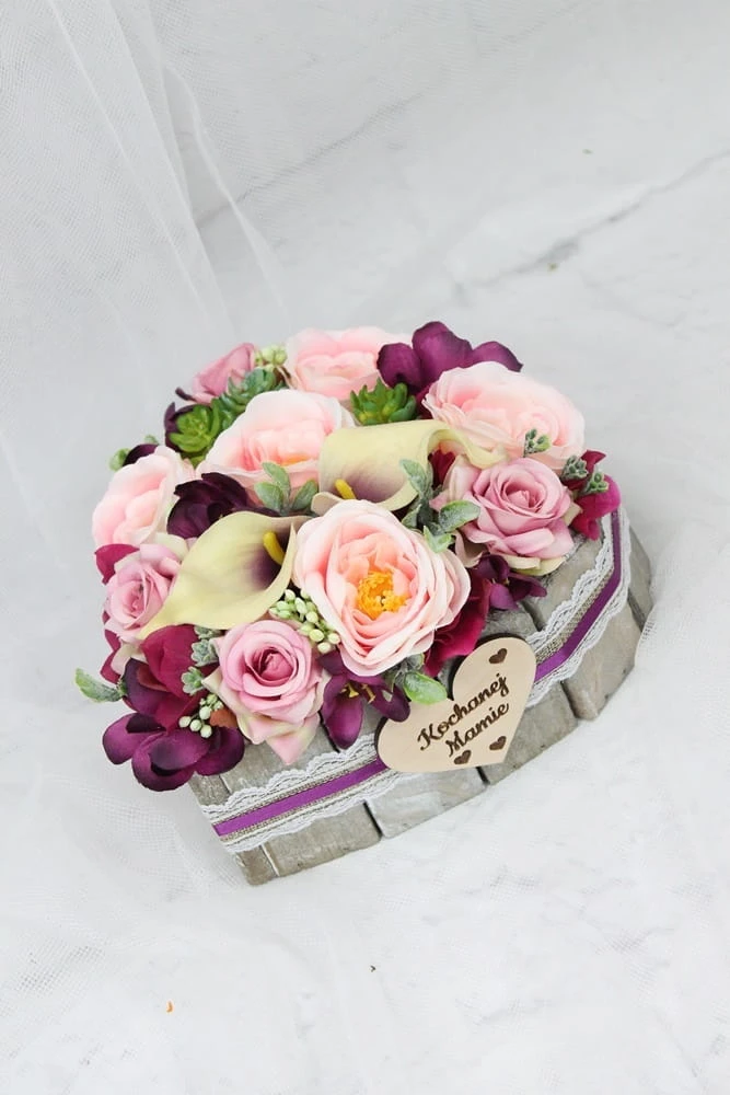 Dodatkową ozdobą kompozycji jest drewniane serce z napisem.