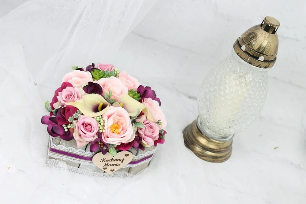 Niezwykle pięknie będzie się prezentowała na grobie lub w kolumbarium. Kompozycja jest obciążona, jest zatem stabilna.