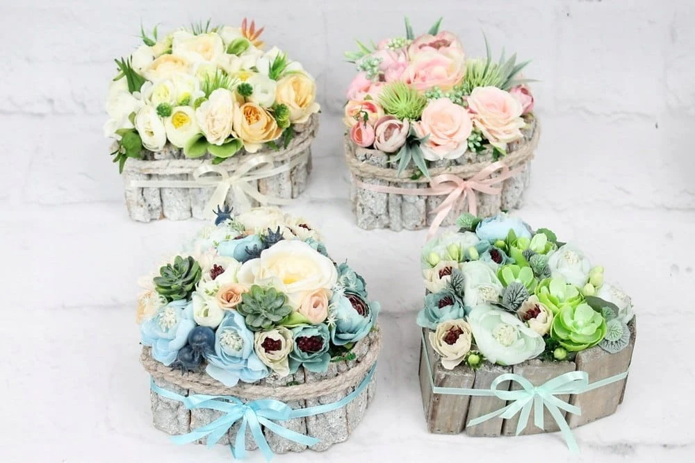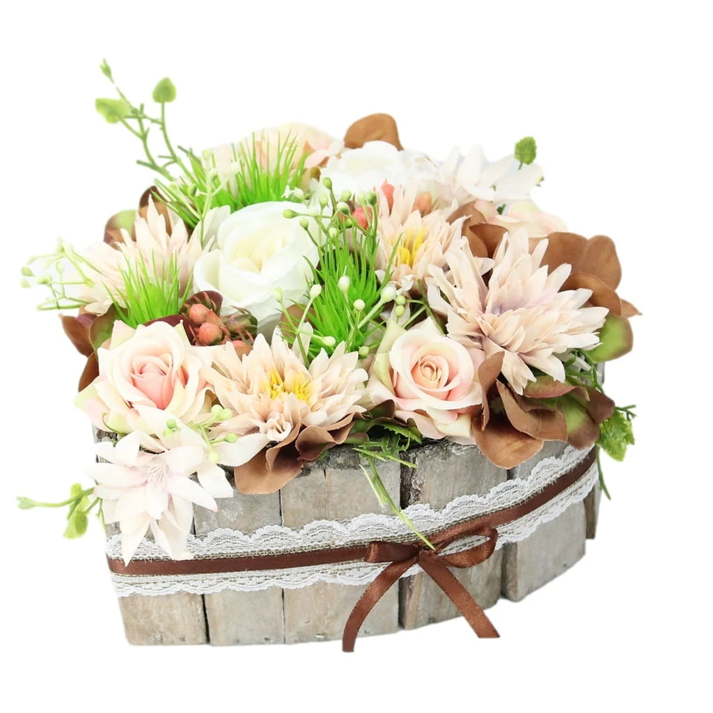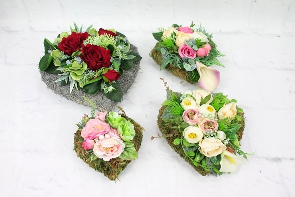 Niezwykle piękna i oryginalna kompozycja nagrobna w kształcie serca, wykonana z wysokiej jakości sztucznych kwiatów w naturalnej podstawie z kory.
