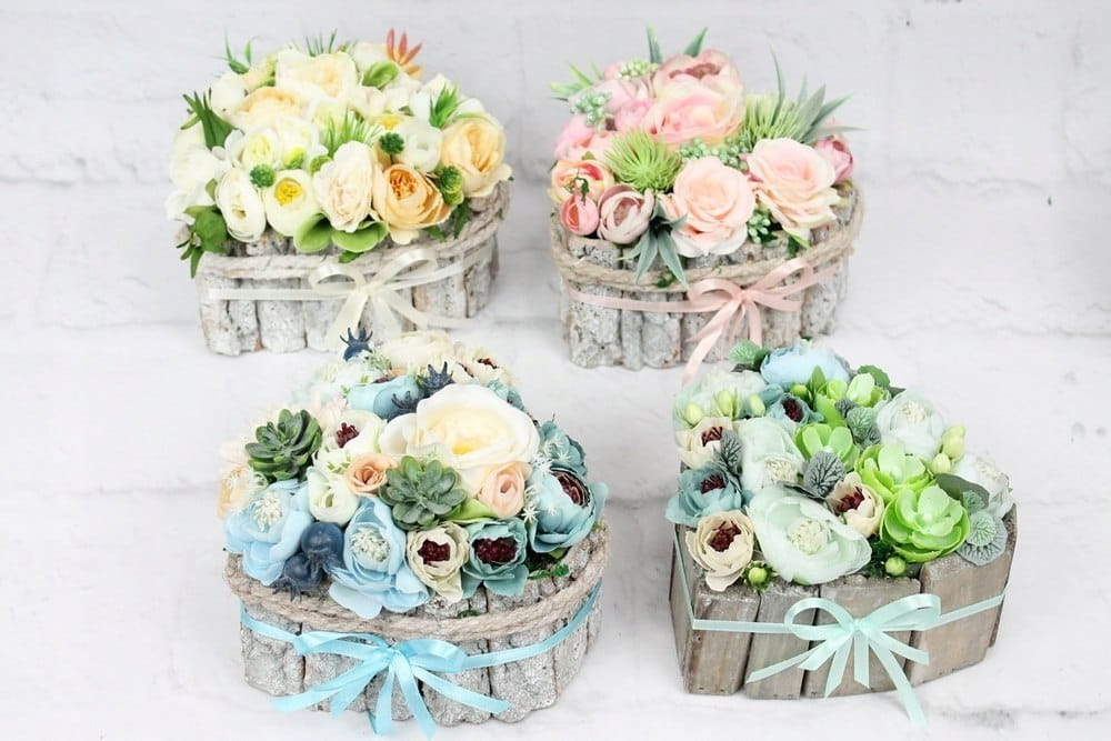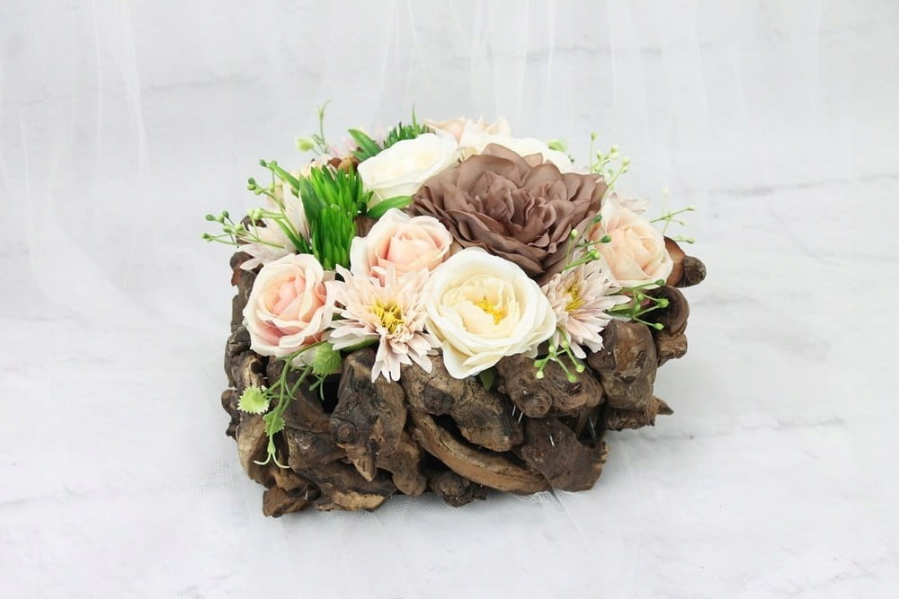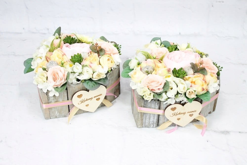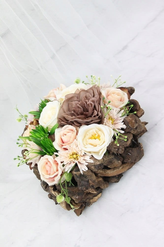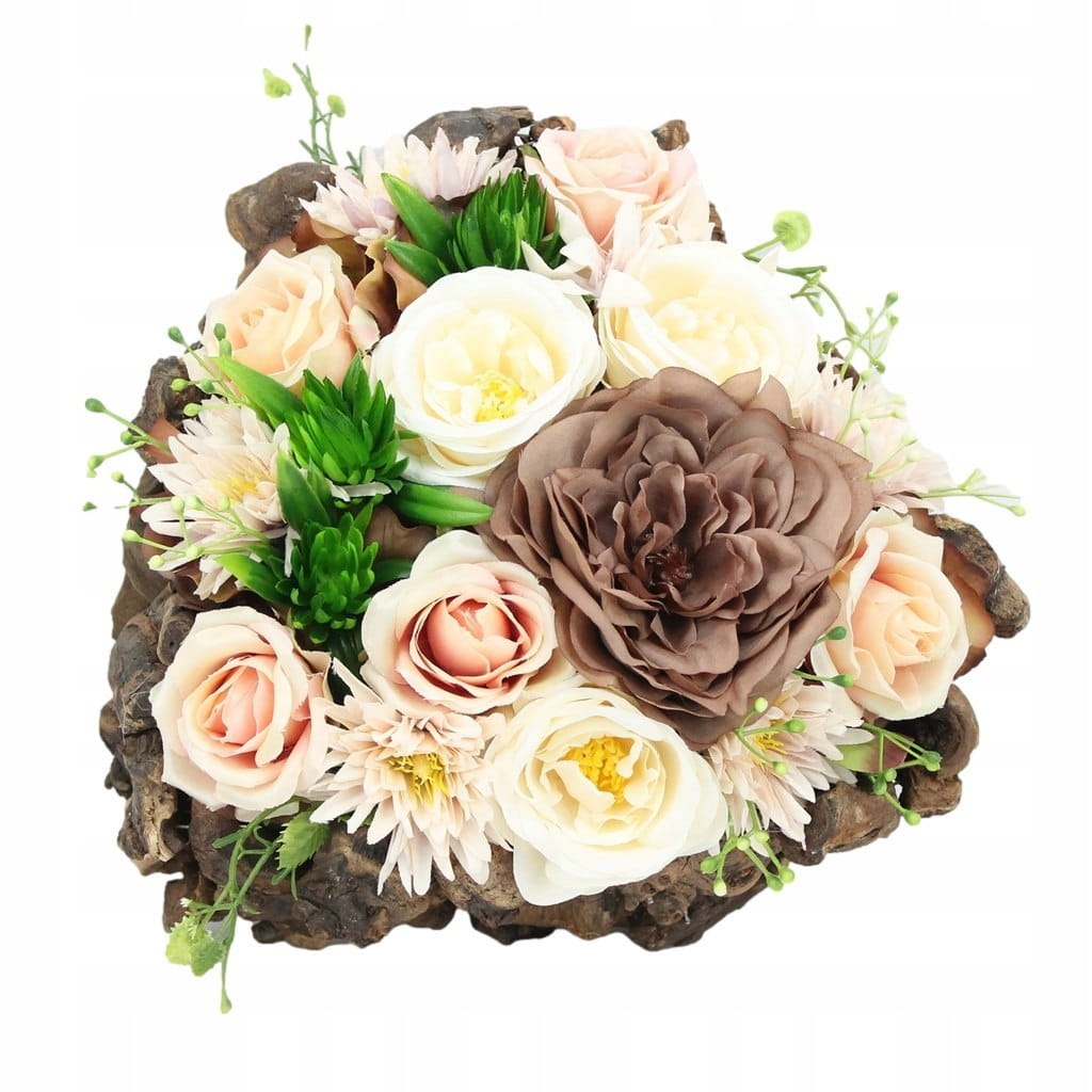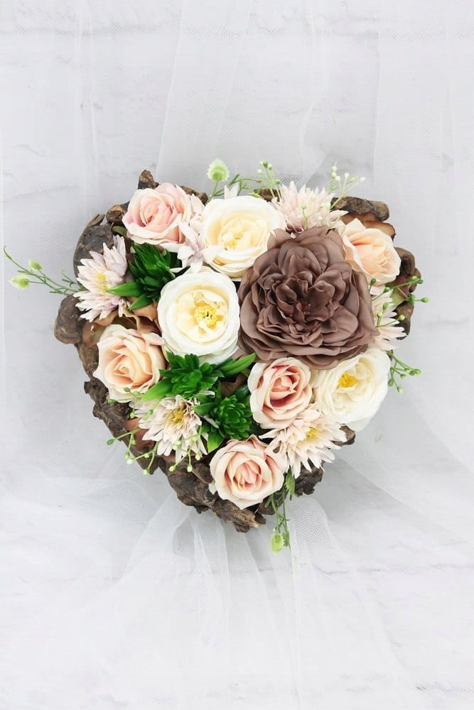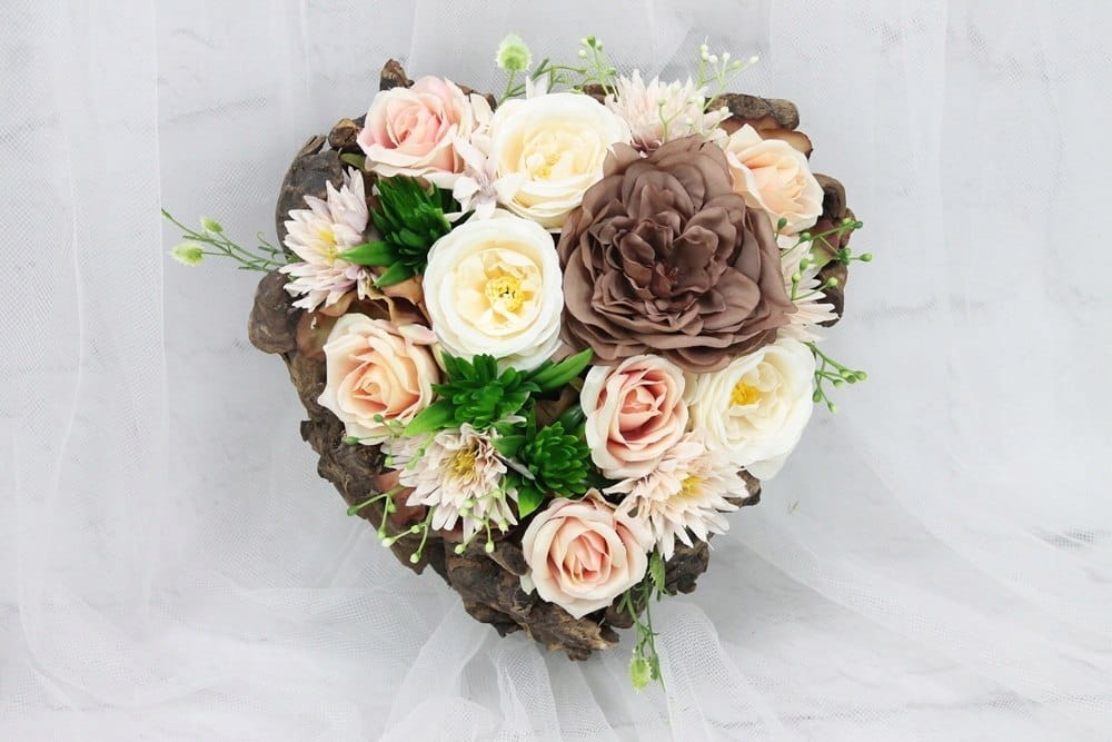 Niezwykle piękna i oryginalna kompozycja nagrobna w kształcie serca, wykonana z wysokiej jakości sztucznych kwiatów w naturalnej podstawie drewnianej z patyków.