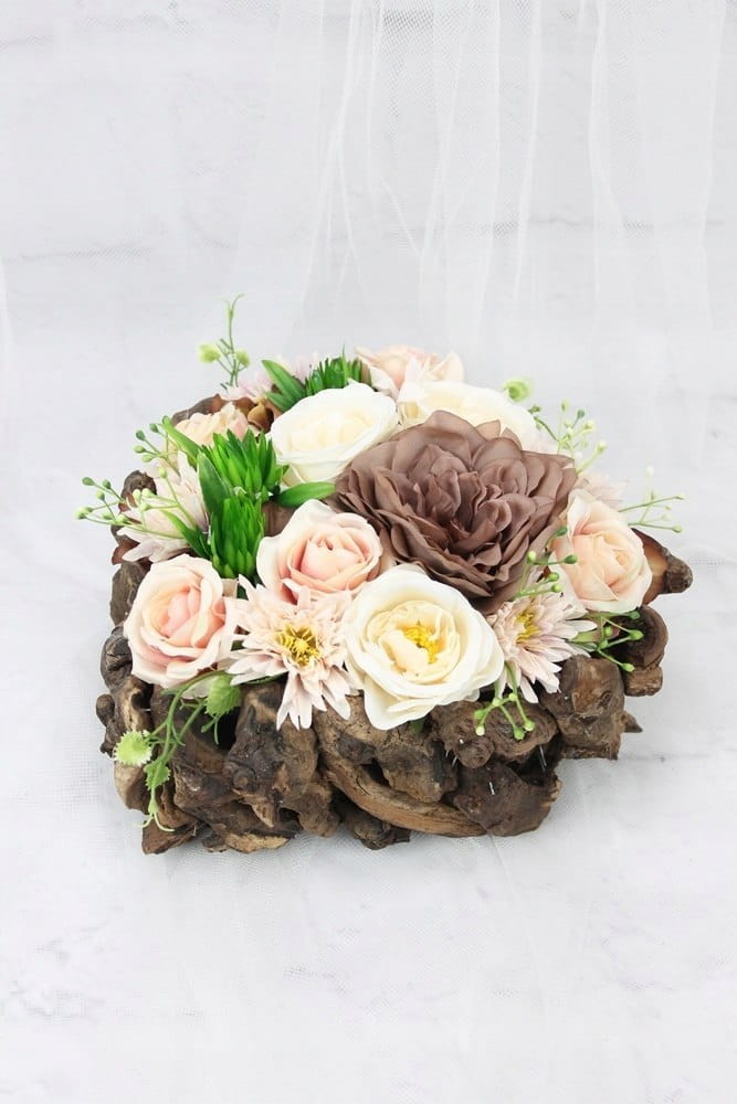 Całość jest utrzymana w tonacji brązu i beżu z dodatkiem zieleni dekoracyjnych liści i traw idealnie wpisujących się w obecne trendy.
