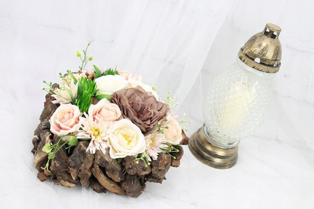 Niezwykle pięknie będzie się prezentowała na grobie lub w kolumbarium. Kompozycja jest obciążona, jest zatem stabilna.